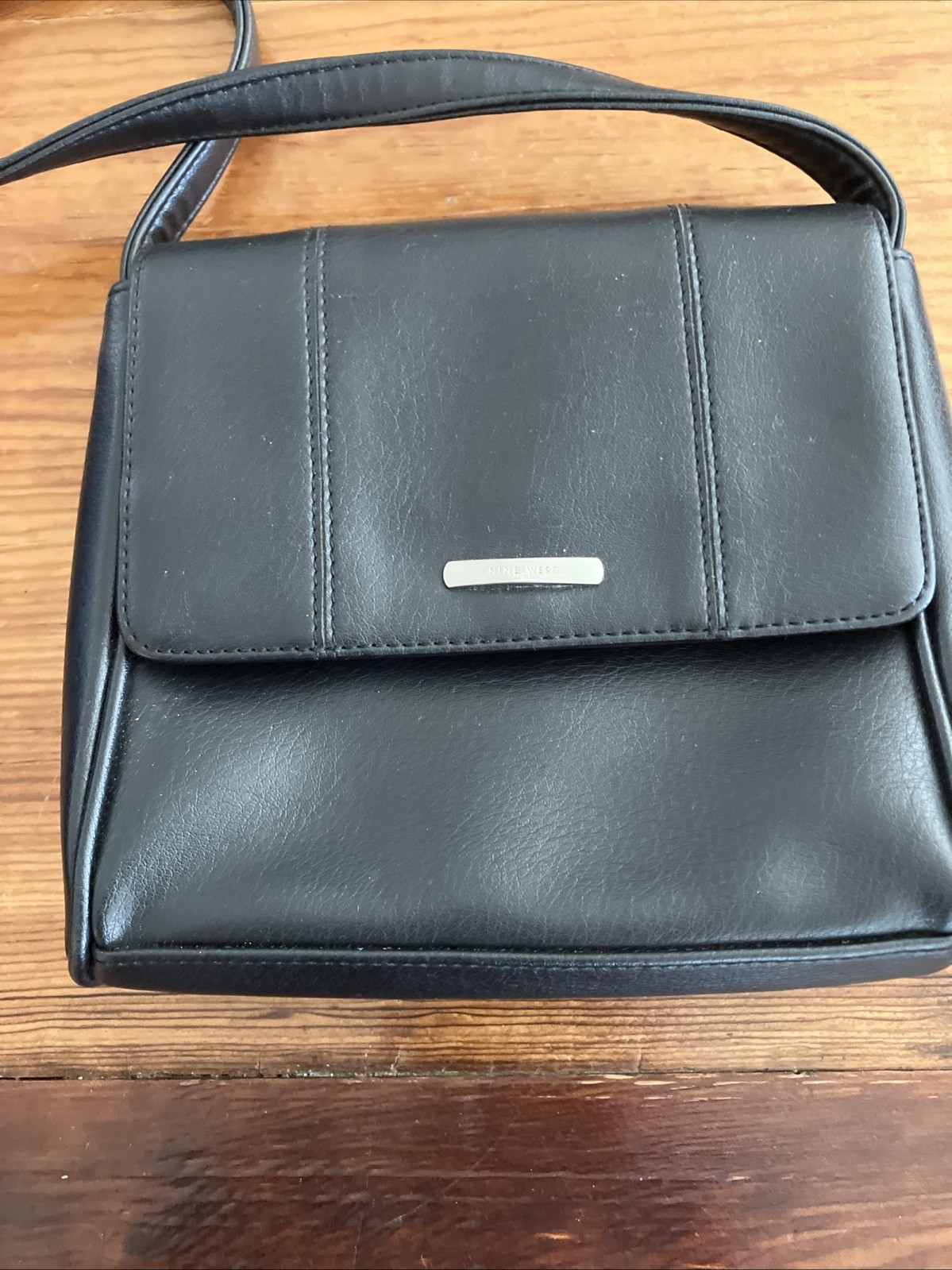 The Vtg NINE WEST Black Faux Leather Crossbody Organizer Shoulder Bag Handbag Purse is a stylish and functional accessory for women. Made from faux leather with a matte finish, this small rectangular bag features a magnetic closure and a crossbody strap handle in black. The bag includes inner pockets and an organizer design, making it perfect for travel, casual outings, or business meetings. The vintage design and silver hardware add a touch of sophistication to this versatile handbag, perfect for everyday use.
