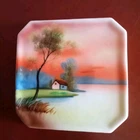 This vintage Noritake Japanese trivet, tea tile measures 5" square and features a hand-painted design of a tree, meadow, and house. Made in Japan post-1940, this multi-color piece is a unique and charming addition to any collection of Japanese antiques.