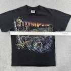 The product is a vintage Oneita Power-T Men's black T-shirt, made in the USA in 1993. This short sleeve shirt features a solid pattern with a crew neck and a regular fit. The shirt is designed with a nature theme and is suitable for all seasons, making it a versatile addition to any wardrobe. Made from knit fabric, this classic shirt is easy to care for and perfect for year-round wear. No holes or stains See pictures for pictured measurements compare with your favorite garment and ask questions if you have any Add to your collection today Browse my other items I can combine shipping