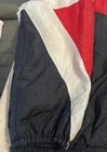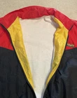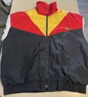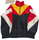 This vintage windbreaker jacket is a must-have for any 90s enthusiast. The red, black, and yellow geometric pattern on the nylon outer shell makes it a statement piece for any casual occasion. The mid-length jacket features a spread collar and full zip closure, with an athletic fit and microfiber fabric type for added comfort. The jacket is perfect for walking in the fall season and is made in China with high-quality nylon lining material. This unit comes in size large and is a regular fit for men. The Black brand logo adds a touch of Y2K nostalgia to this classic piece. This jacket is in good preowned condition with some light signs of wear, please see ALL photos for a better idea on condition, any measurements, or details to the jacket.