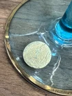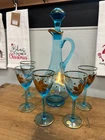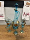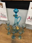 Add a touch of elegance to your bar with this vintage Romanian aqua blue decanter and five cordial glasses. The decanter, made of blown glass, stands at 15 inches tall and features a beautiful gold trim and floral motif. The glasses are similarly designed with a mid-century modern style and are perfect for serving your favorite cocktails. This set is perfect for collectors of unique and stylish barware. The decanter and glasses were made in Romania and feature a painted backstamp. The color blue adds a pop of color to any bar or collection. Use this set for special occasions or display it in your home for a touch of sophistication.