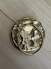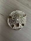 Add a touch of elegance to your scarf with this vintage gold-plated Sand Dollar clip. The intricate design of the Sand Dollar is inspired by nature and adds a unique twist to any outfit. This scarf clip is perfect for those who love the Artisan Pieces and appreciate Ocean & Beach designs. The clip is a stunning piece that is sure to grab attention. Ideal for anyone looking for a unique scarf accessory. In like new condition. Looks New