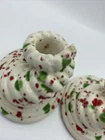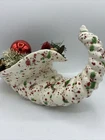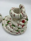 Centerpiece measures approx. 14"x8" and is filled with vintage glass ornaments and floral picks, Taper candle holders measure 5"x4". Both items have age related crazing and a few chis on the glaze . Please see photos, I tried to get pictures of all imperfections. Hassle fee returns