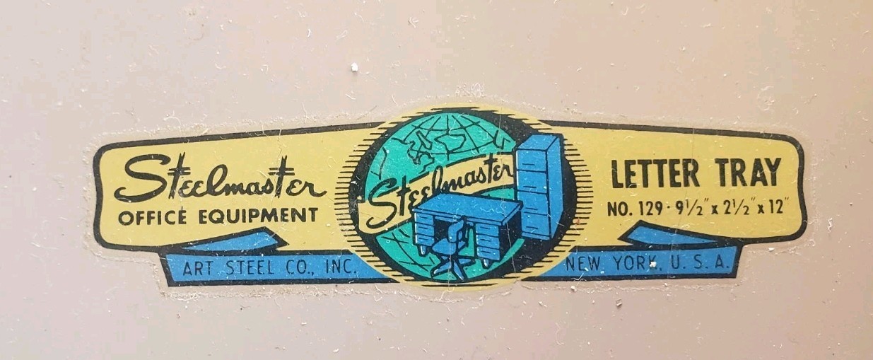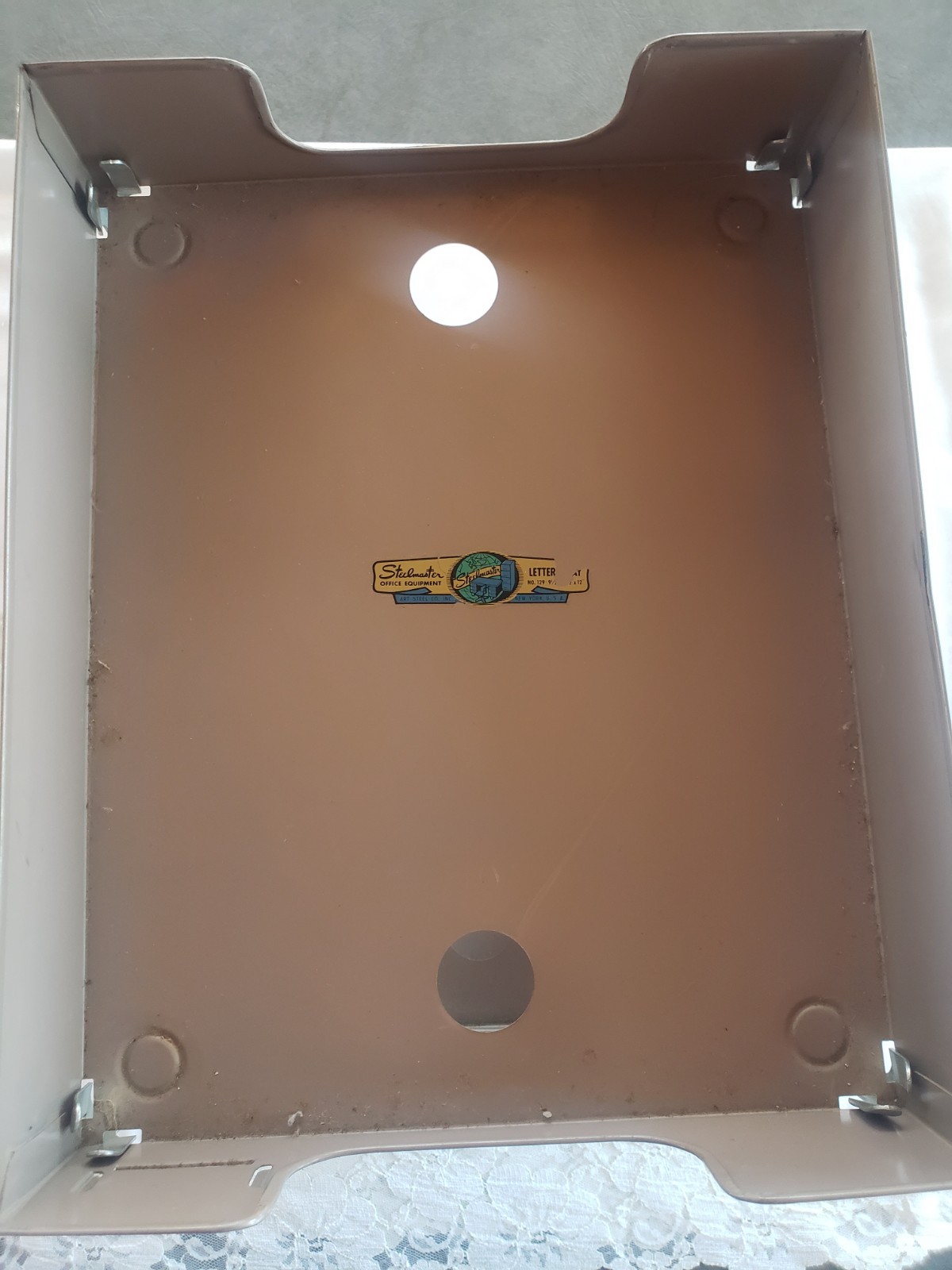 This vintage steel office stackable desk file letter tray organizer by Art Steel is a solid rectangular tray in a desert sand color. Made of metal with a sturdy steel finish, this desk accessory is designed for office work and includes three standard-size trays perfect for organizing letters and paper. Manufactured in the United States, this desk file letter tray organizer is easy to clean by wiping with a dry cloth and weighs 2 pounds, making it a durable and practical addition to any office workspace.