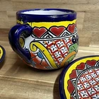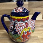 For sale is a gorgeous vintage hand-painted Talavera pottery miniature chocolate/coffee set, made in Mexico. Authentic Talavera from the Puebla/Tlaxcala region in the classic cobalt blue and multicolored pattern. Set includes: ✓ Lidded chocolate pot (chocolatero) with spout – 8” tall ✓ Two-handled sugar bowl – 3” tall ✓ Two matching saucers – 4.75” diameter each All pieces marked on the bottom “LEAD FREE MEX.” in underglaze ink – dating it to the early 2000s when Mexican potters began complying with U.S. lead standards. 100% lead-free and safe for serving food/beverages. Condition is excellent – no chips, cracks, or repairs. Bright colors, minimal crazing, glossy glaze. This exact pattern and size combination with the sugar bowl is getting very hard to find. Perfect for collectors of Mexican folk art, Talavera completists, or as a unique display piece. Looks stunning on a kitchen shelf or in a china cabinet. From a smoke-free, pet-free home. Packed very carefully with lots of bubble wrap – I’ve shipped dozens of Talavera pieces with zero damage.