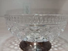 Beautiful ring to this crystal bowl! There are no chips or cracks, but the silver plate base has tarnish. Please view all photos. Approx Dimensions Height: 4.25" Diameter: 7.5"