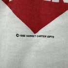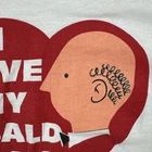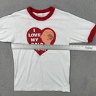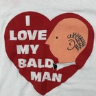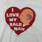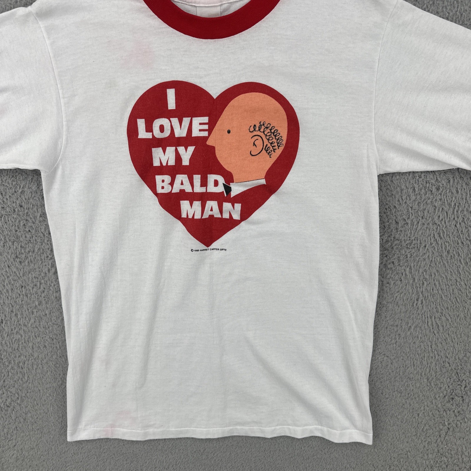 The product is a vintage Tennessee River white ringer shirt from 1988 featuring a graphic design that reads "I Love My Bald Man." This 80s-inspired graphic tee is made of cotton with a knit fabric type, featuring a solid pattern, short sleeves, and a crew neckline. The shirt has a regular fit and is suitable for all seasons, making it a unique and nostalgic addition to any man's wardrobe. No holes. Small stains see pictures. Looks as though the red from collar bled. Not too bad See pictures for pictured measurements compare with your favorite garment and ask questions if you have any Add to your collection today Browse my other items I can combine shipping