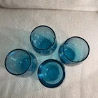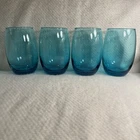 Add a touch of contemporary elegance to your drinkware collection with this vintage set of four stemless wine glasses. The glasses feature a solid turquoise color and a round shape with a diameter of 2.75 inches and a height of 5 inches. The glasses have a capacity of 16 ounces and come in a set of four, making them perfect for hosting a dinner party or a beach house getaway. Crafted from high-quality glass material, these wine glasses are both durable and stylish. The glasses are unmarked, adding to their contemporary appeal. The set is an original and is not a licensed reproduction. The glasses are both decorative and functional, making them a great addition to any home. Excellent condition. No chips or cracks.