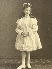 Victorian Cabinet card portrait of wealthy young girl in beautiful white frilled ruffle lace dress, stockings and high button shoes Adorned with jewelry, bracelets necklace and rings 6x4 inch Photograph on 7.5x5.5 inch board by Studio Grand, 8th & Race, Cincinnati Ohio Note: damage to upper left corner of board see photos Thank you