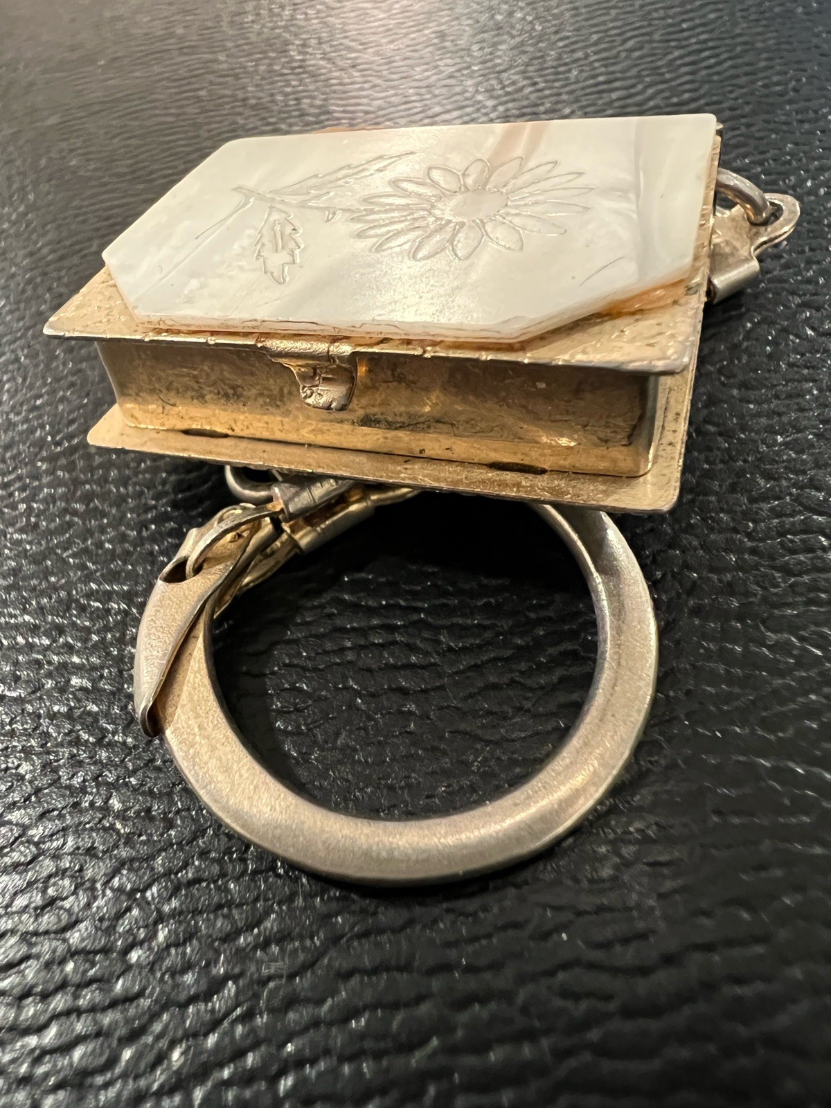 The Vtg Vogue French Perfume Locket Book Keychain from The Royal House of Edward is a vintage accessory that exudes elegance and sophistication. Made with mother of pearl and metal, this keychain features an ivory and gold color scheme that adds a touch of luxury to any outfit. With its French origin and unique design, this original piece is perfect for any occasion and is a must-have for any fashion-forward individual.
