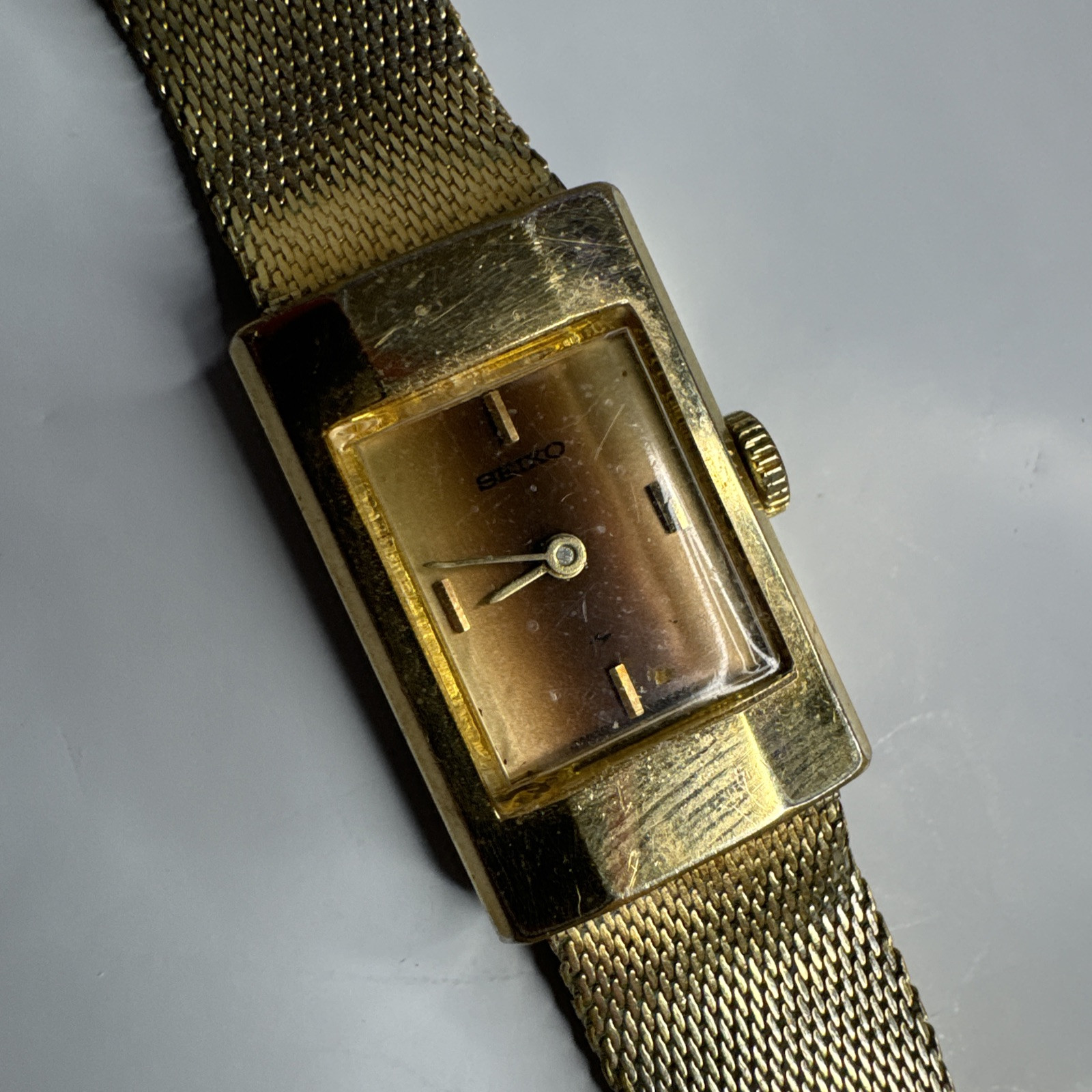 This vintage Seiko wristwatch for women features a gold-tone bezel and case with a matching gold band. The dial comes in a classic combination of gold and silver, displaying the time with analog movement. The watch is a mechanical (manual) model with 17 jewels, made in Japan. It does not come with papers, service records, original box/packaging, or manual/booklet. This Seiko watch is described as working and keeping time accurately, making it a stylish and functional accessory for any outfit.