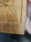 This vintage wood sculpture is a beautiful piece by Jeanne Jugan, produced in 1978. The intricate carving of a woman's face in 3D style is a stunning addition to any art collection. The sculpture is in its original format as a cameo, and is a 1st edition. The sculpture is made of high-quality wood and features a unique production technique. It is a perfect fit for any art lover who is looking for a medium-sized piece to display in their home or office. This sculpture is a must-have for collectors and enthusiasts of all ages who appreciate the beauty of wood carvings.