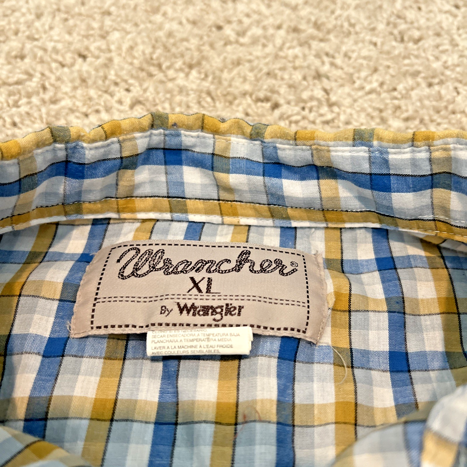 Vintage Wrancher by Wrangler Pearl Snap Shirt – Men’s XL – Blue Plaid – Western Cowboy Style Step into classic Western style with this vintage Wrancher by Wrangler pearl snap shirt. A timeless piece featuring bold blue plaid and authentic cowboy details, perfect for collectors or everyday wear. Item Details: Brand: Wrancher by Wrangler Size: Men’s XL Color: Blue Plaid Style: Long sleeve Western shirt Material: polyester - cotton blend Gender: Men’s Key Features: Classic pearl snap front and cuffs Traditional pointed Western yoke (front and back) Two snap-flap chest pockets Durable, lightweight material Timeless cowboy/ranch style—great for rodeos, concerts, or casual wear Condition: Gently pre-owned vintage condition. No major flaws—clean and ready to wear! This vintage Wrancher Western shirt blends rugged charm with classic country style. A standout piece for fans of Wrangler and Western heritage wear. 📦 Fast shipping ✅ Trusted seller 📸 Actual photos of the item shown