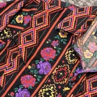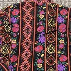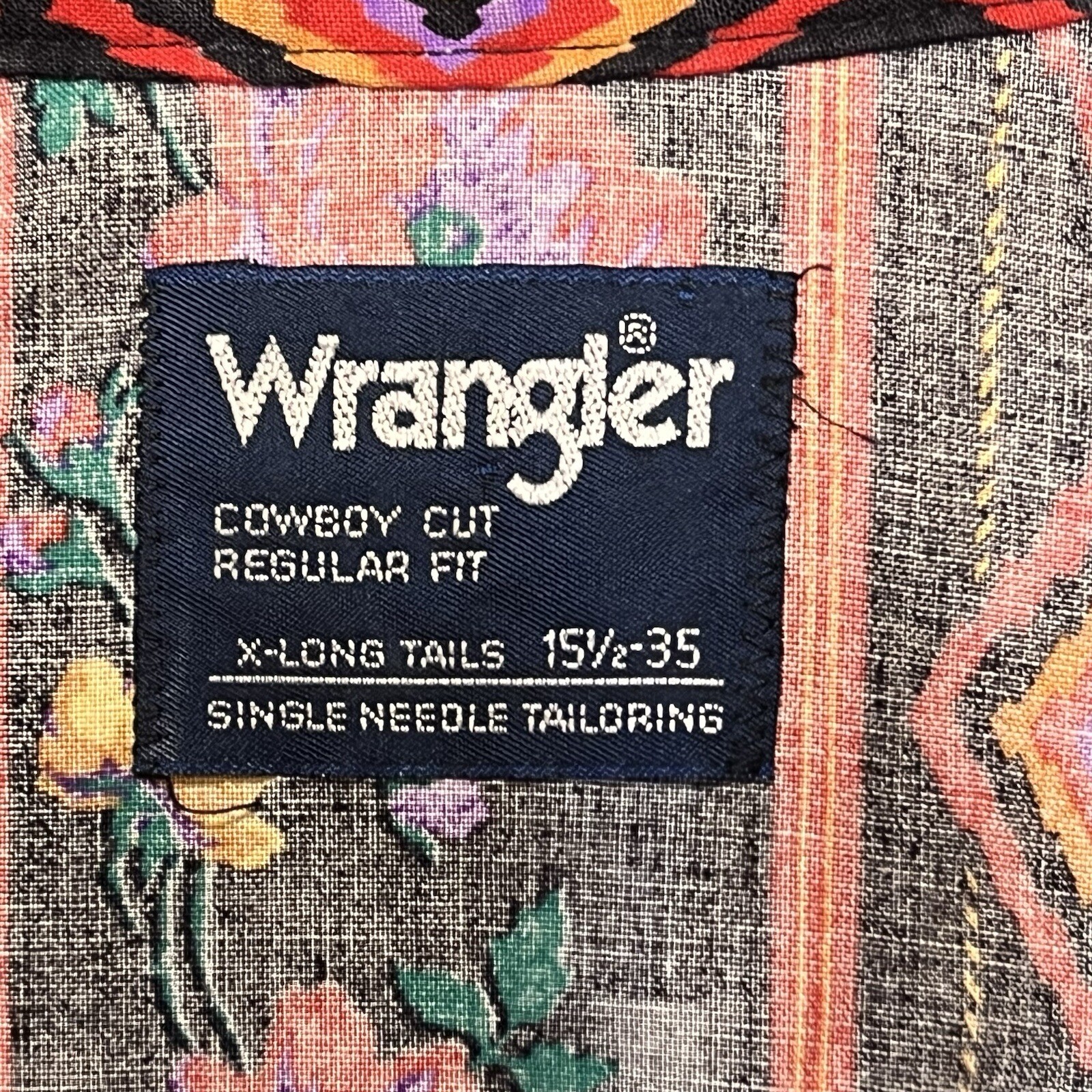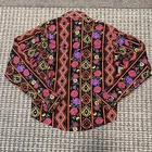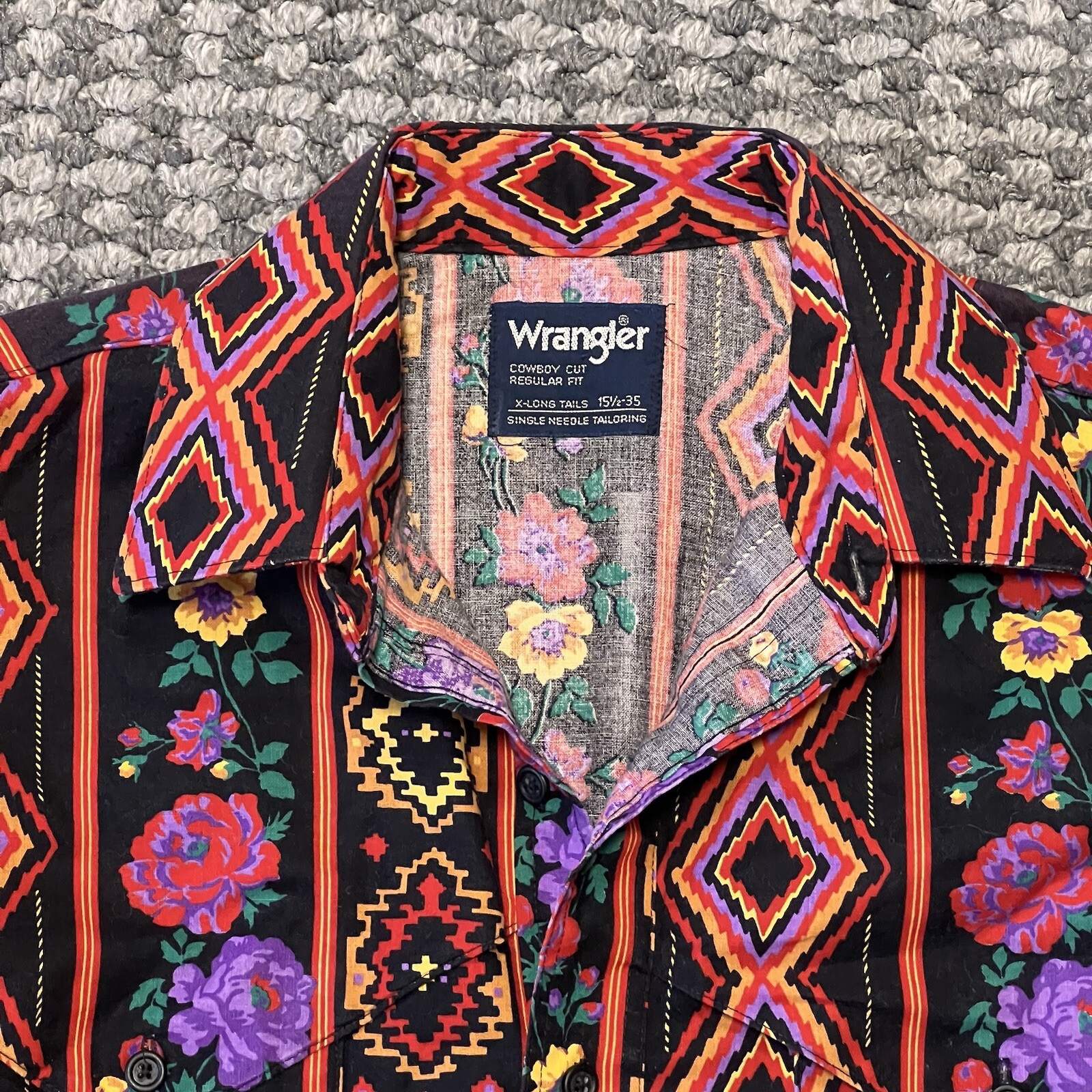 This vintage Wrangler shirt for women features a colorful floral Aztec pattern, embodying a Western cowboy cut style with retro 80s vibes. Made with 100% cotton fabric in a woven material, the long sleeve button-up top has a collared neckline and a cropped fit, perfect for a party or casual wear. With classic fitted sleeves and button accents, this multicolored shirt in size M exudes a unique and vibrant appeal, ideal for adding a touch of Western flair to any outfit.