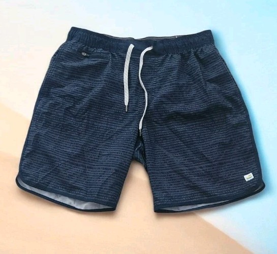 The Vuori Banks Shorts Men's Blue Striped Athletic Board Swimming Hybrid Gym Run! in size M are designed for active men seeking comfort and functionality in their activewear. Made from a blend of polyester and spandex, these athletic shorts feature a striped pattern in blue, making them stylish for various outdoor activities like gym training, walking, or running. With features like pockets and a drawstring waist, these shorts offer practicality in addition to performance. The modern design and brand reputation of Vuori ensure a quality product for any man's workout wardrobe. In good condition Waist 32" Inseam 7.5" #917