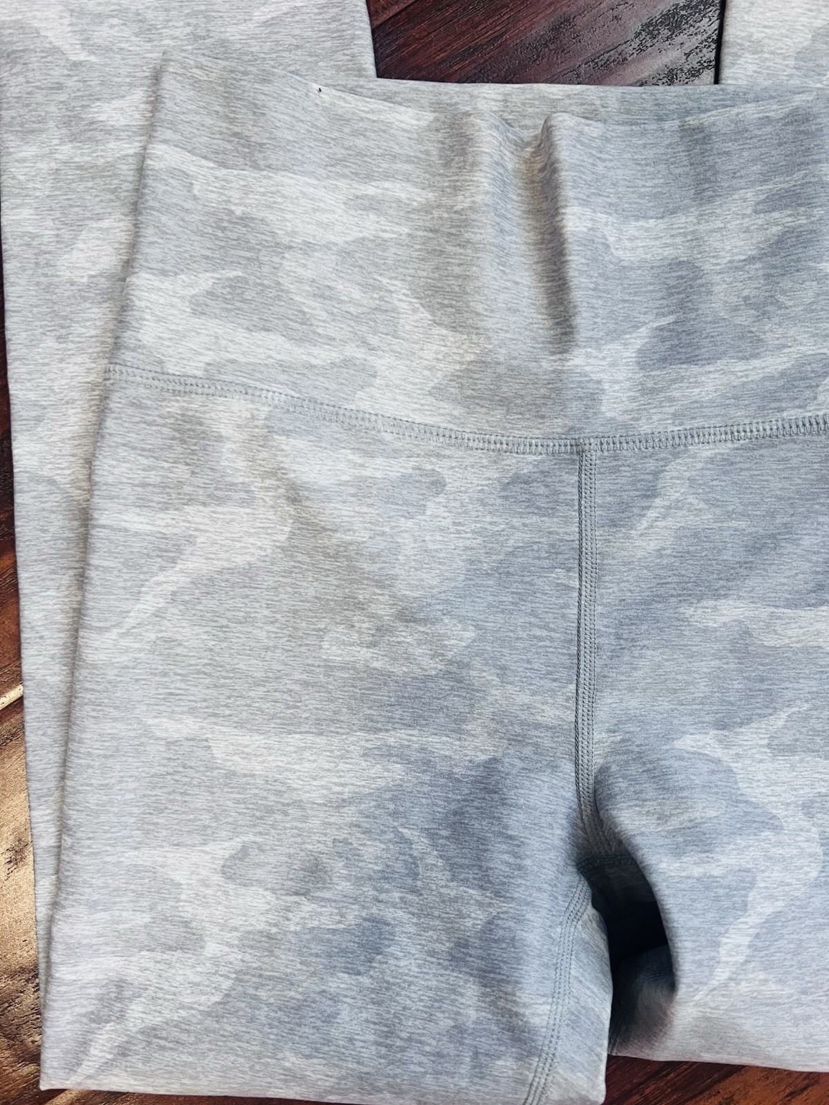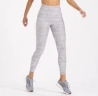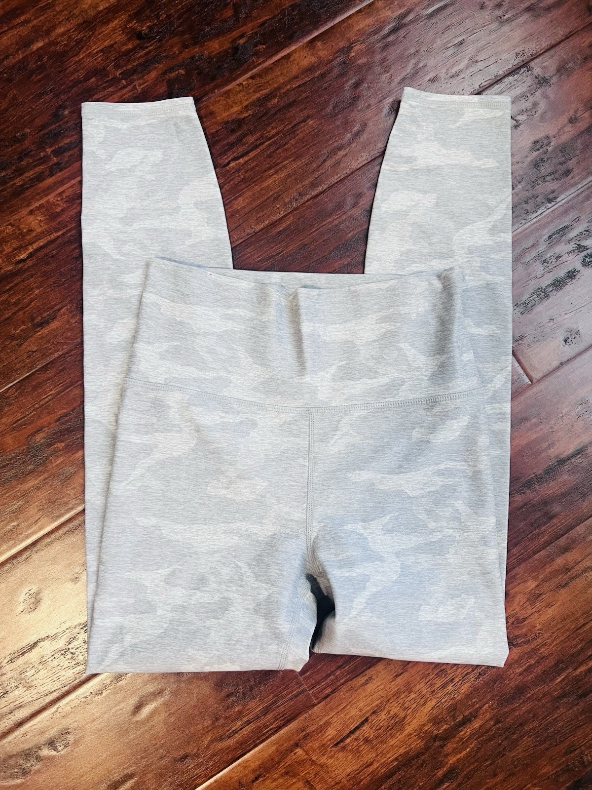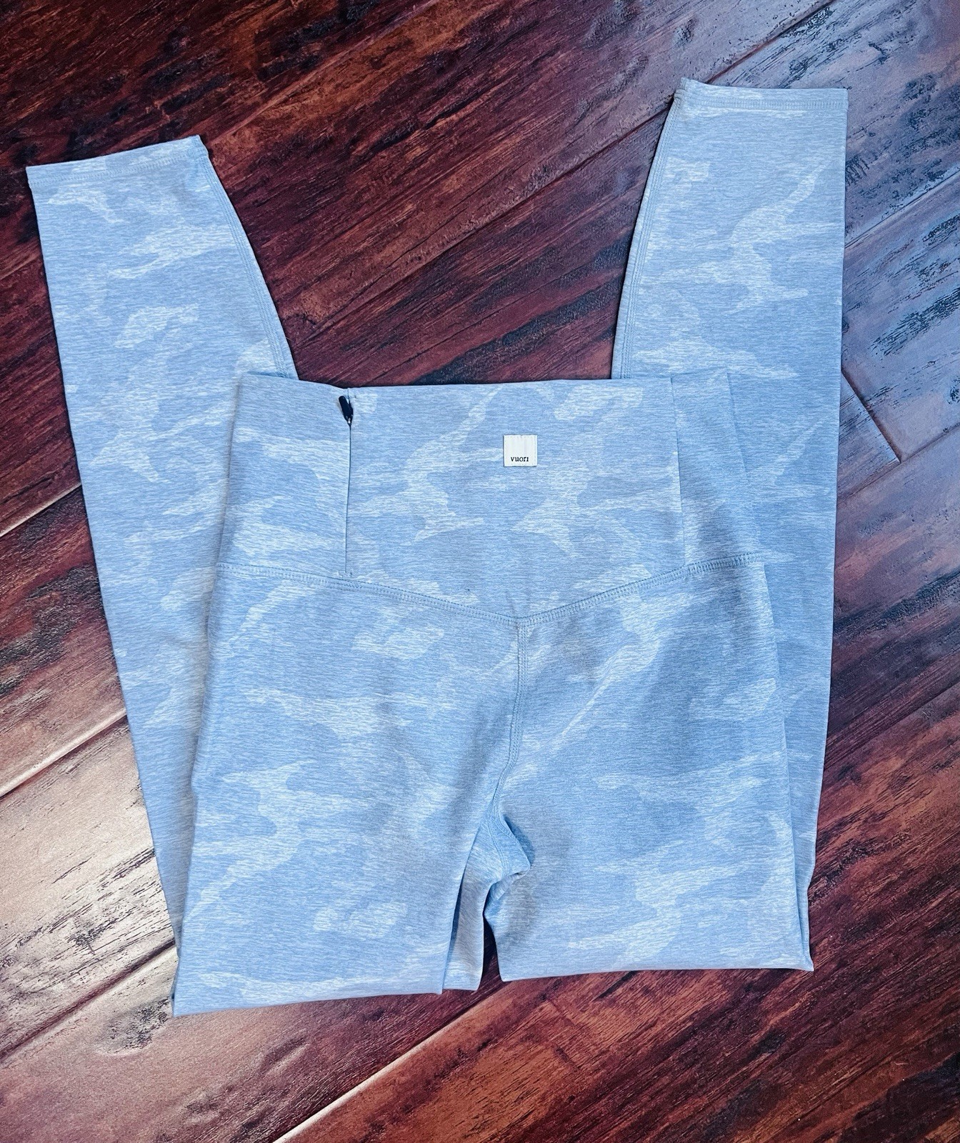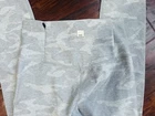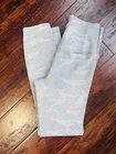 The Vuori Clean Elevation Camo Leggings are a stylish and functional addition to any woman's activewear collection. These high-rise leggings feature a comfortable and stretchy knit fabric, making them ideal for yoga, hiking, or any other active occasion. The camouflage pattern adds a trendy touch, while features like an elastic waist, zip pocket, and breathable material ensure both style and performance. In excellent condition.