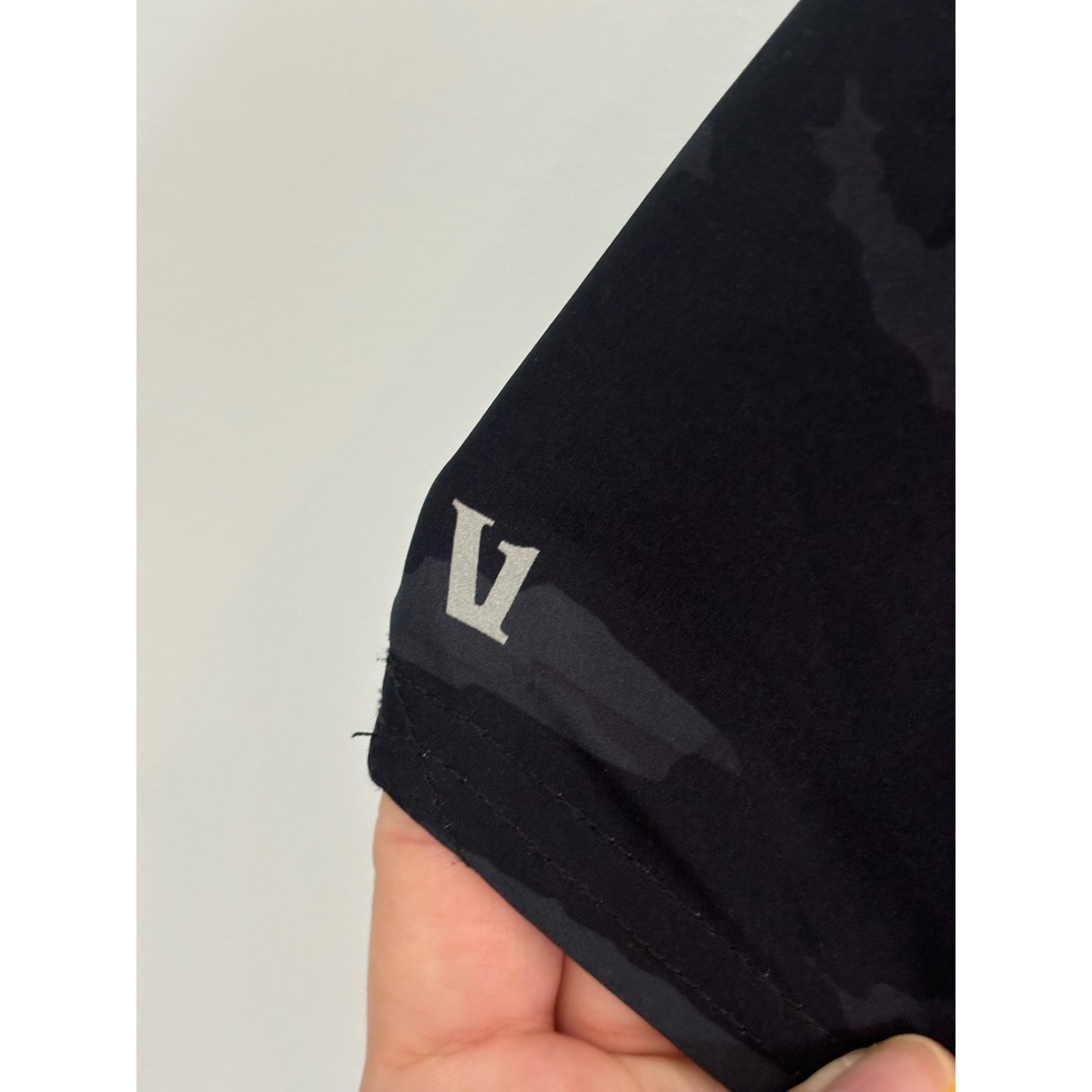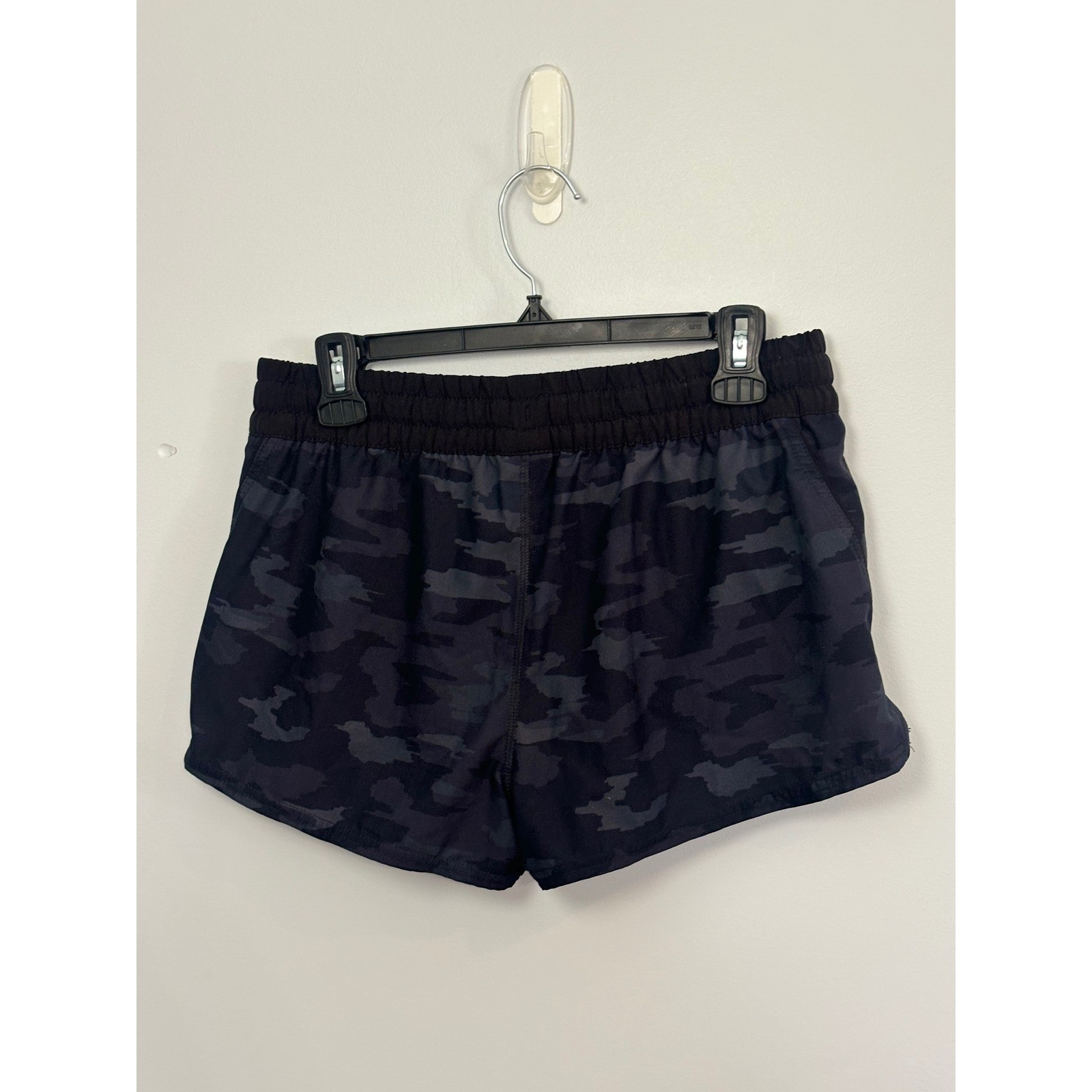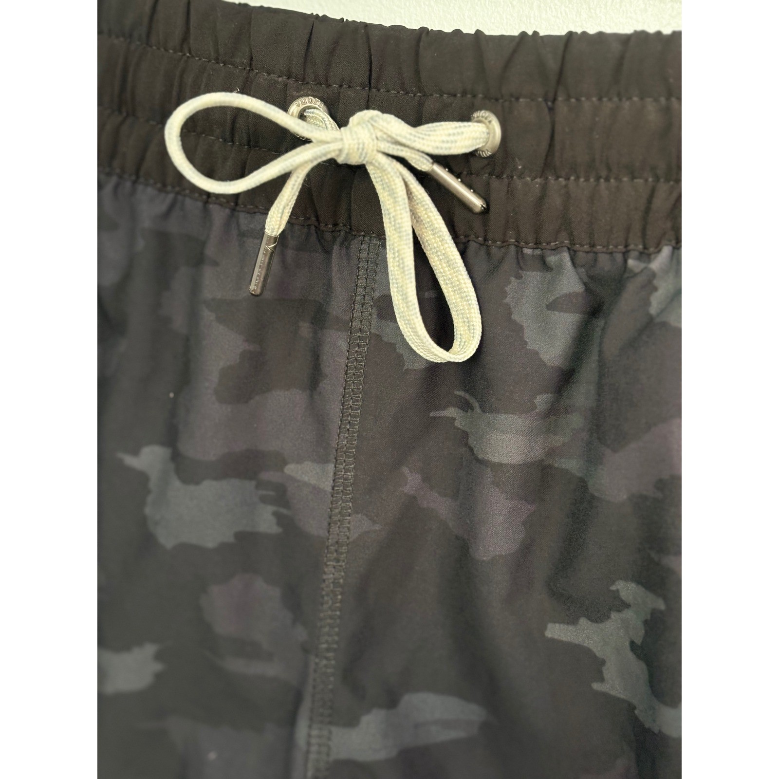 Elevate your workout wardrobe with these stylish and functional Vuori running shorts. A sleek camo print in shades of black and gray offers a modern, edgy look, while the comfortable elastic waistband with drawstring ensures a secure and adjustable fit. These shorts feature a built-in liner for added support and coverage, plus a convenient zip pocket to keep your essentials safe during your run. The lightweight fabric allows for maximum breathability and freedom of movement, making them perfect for high-intensity activities. The subtle 'V' logo on the leg adds a touch of understated branding. Ideal for jogging, gym workouts, or casual athleisure wear. Color: Black Department: Women Style: Athletic Performance/Activity: Running & Jogging, Gym & Training, Athleisure, Workout, CrossFit Fit: Regular Character: Wonder Woman, Surfer Girl, Hero, Power Girl Material: Polyester, Polyester Blend, Spandex Keywords: Vuori, running shorts, athletic shorts, gym shorts, camo print, workout shorts, women's shorts, medium, the rise and shine, elastic waistband, zip pocket, activewear, athleisure, black camo, gray camo