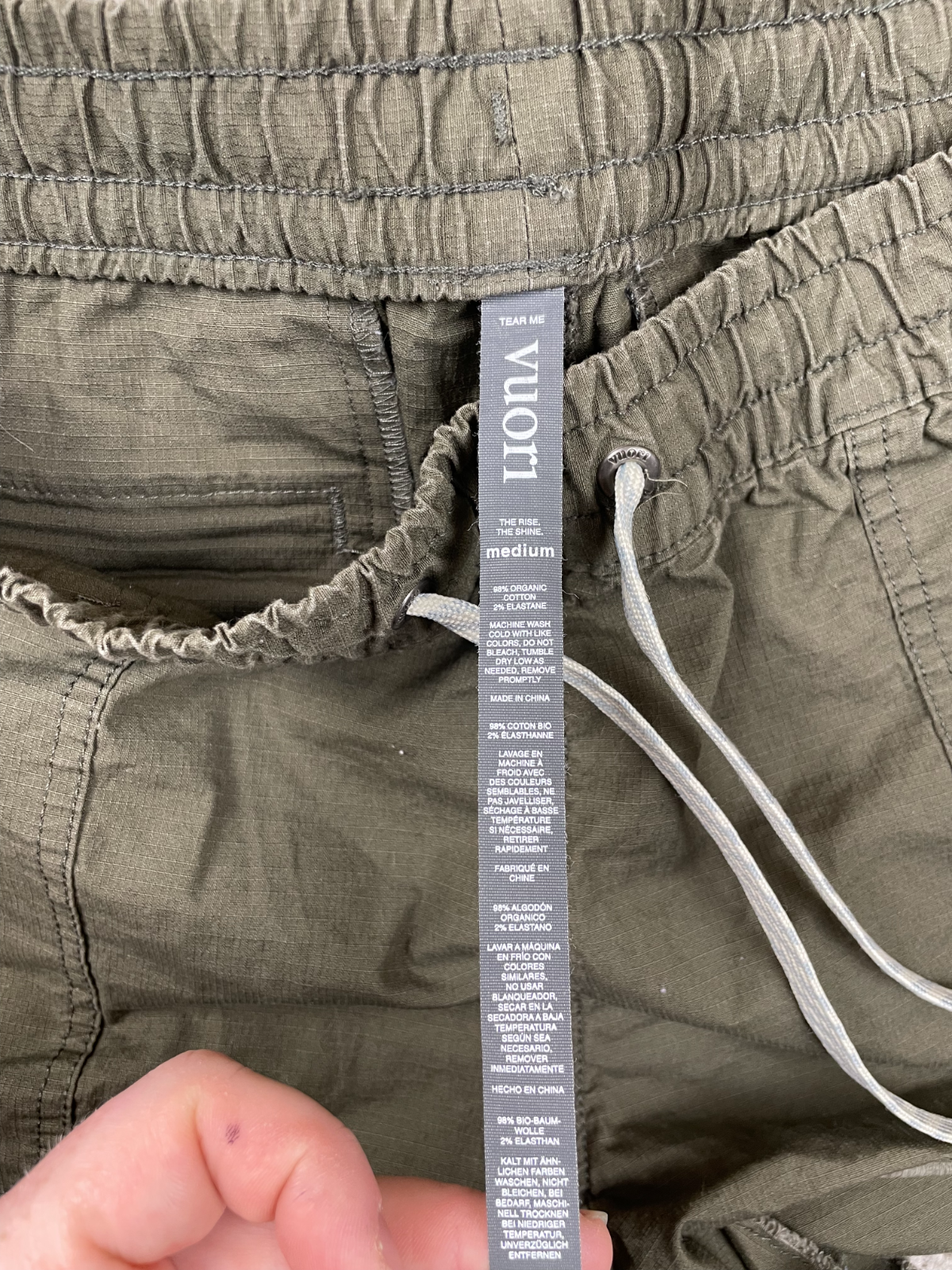 The Vuori Women's Shorts in size M feature a 3" inseam and a durable green ripstop material with a frayed hem. These athletic shorts are designed for active occasions and are machine washable for easy care. With a drawstring closure and pockets, they provide a comfortable fit for women looking to workout or run in style during the summer and spring seasons. Made by the brand Vuori, these shorts offer a regular fit and are perfect for those seeking high-quality activewear.
