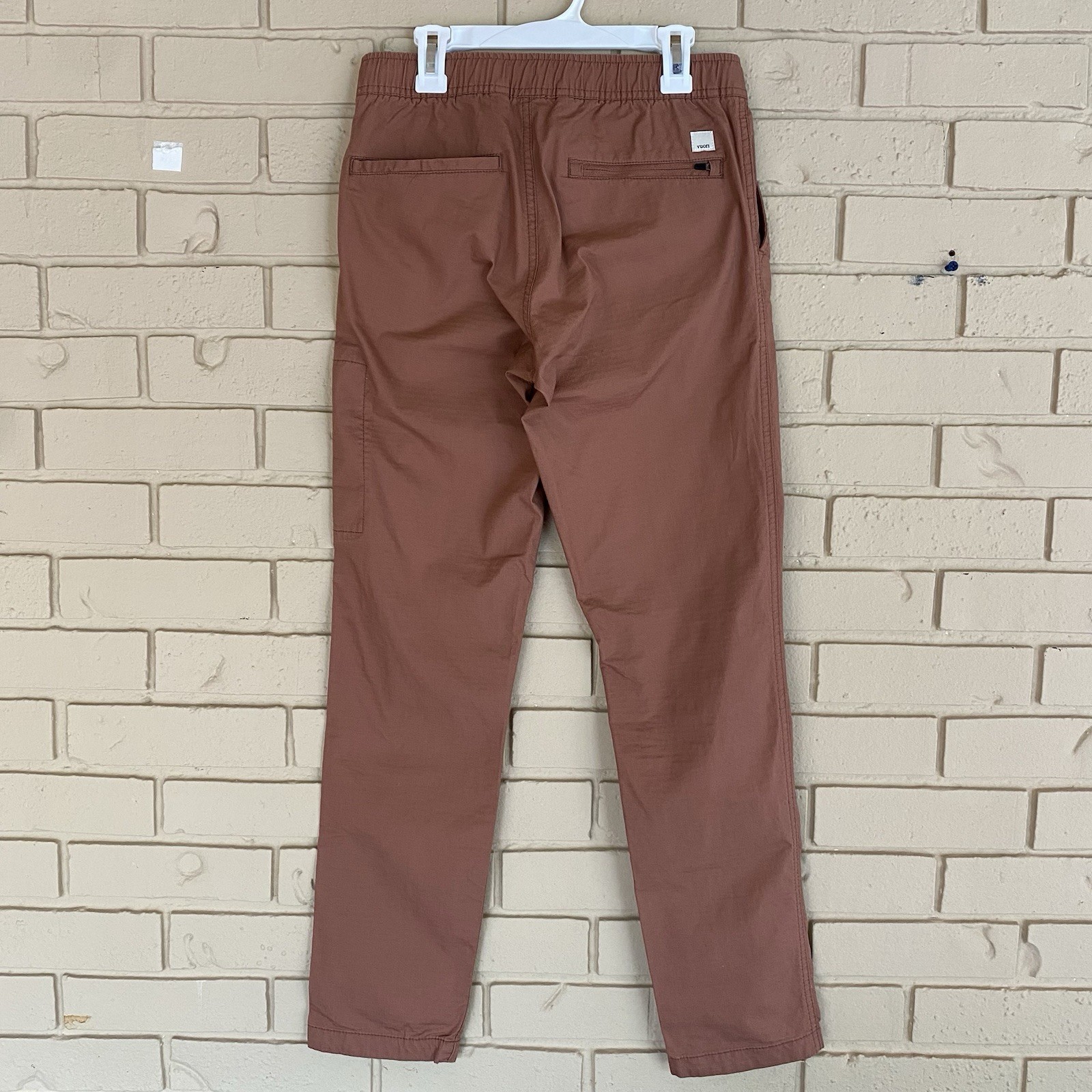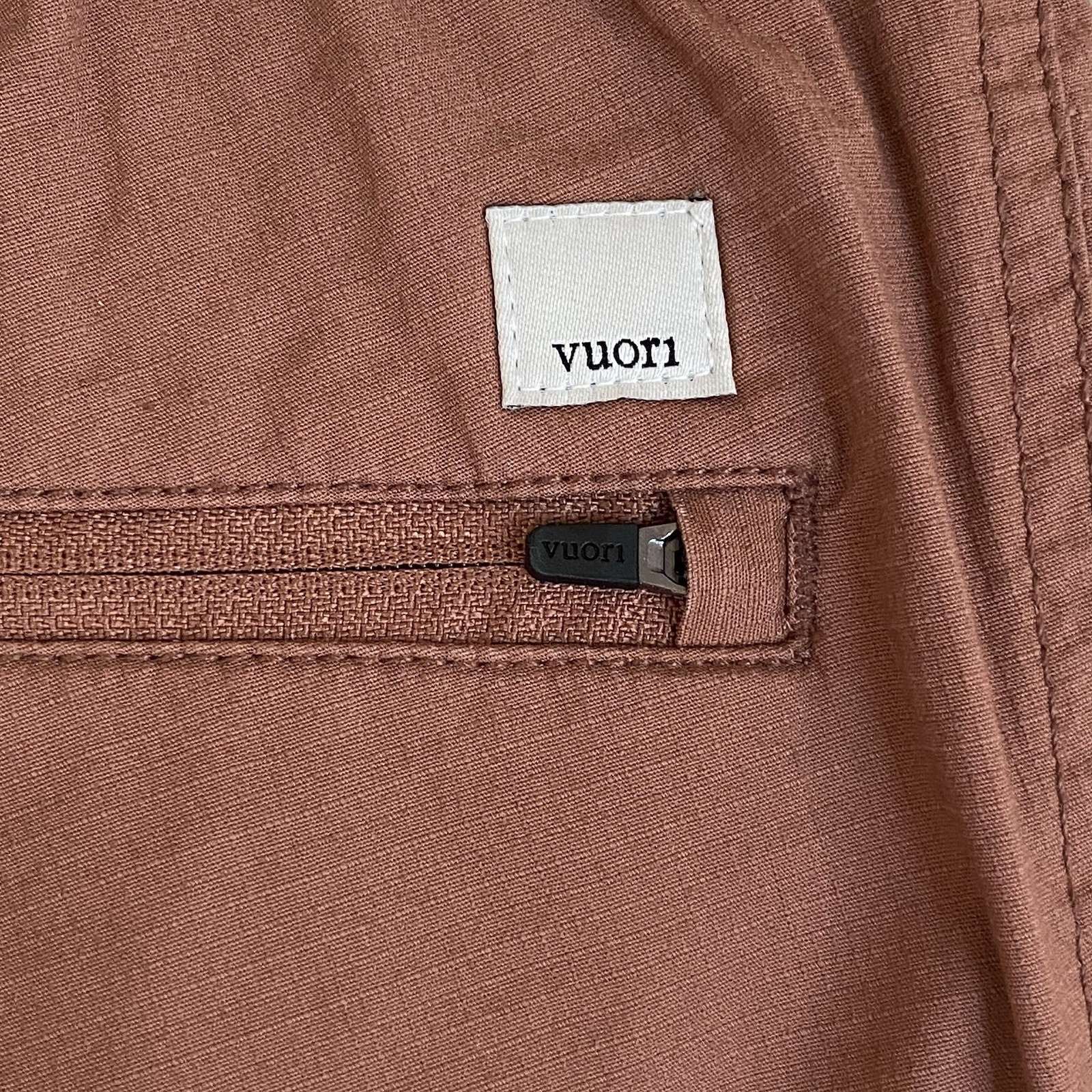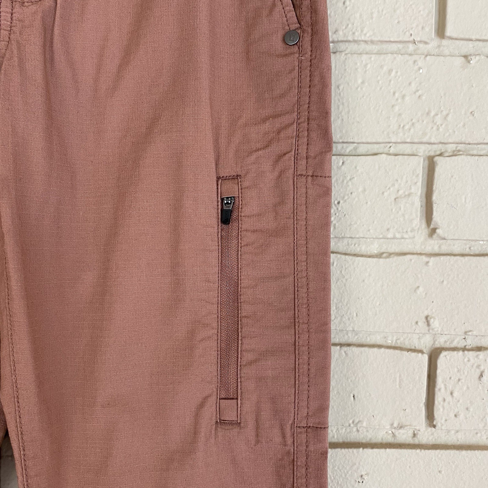 Vuori The Rise And Shine Rip Stop Pants are perfect for any athletic activity. The pants are designed with a pull on closure and elastic waistband for a comfortable fit. The breathable and stretchy material makes them suitable for any season. The pants have a straight leg style and come in a solid rust color. The pants are made of a cotton blend fabric and have a zip pocket for added convenience. The Vuori The Rise And Shine Rip Stop Pants are ideal for gym and training, walking, cross-training, yoga, and Pilates. These pants are perfect for women in size XS with a waist size of 28 inches and an inseam of 29 inches. Note: drawstring has been removed