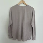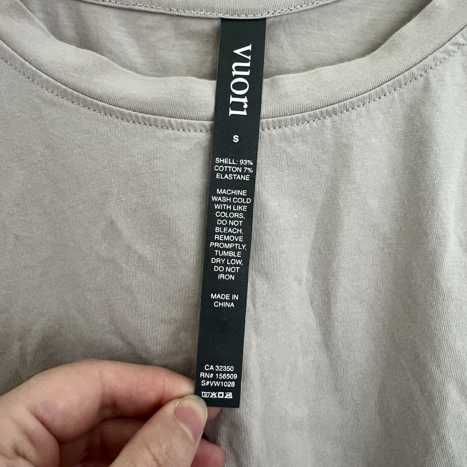 The Vuori Long Sleeve Feather Tee for women in size small in the color cobblestone is a solid gray activewear top made from a blend of polyester and spandex. It features a crew neck and long sleeves, making it perfect for gym training, cross training, and running. The pullover style with a medium fabric wash and athletic fit offers comfort and functionality for active women looking for a high-performance tee. Easy to care for with machine washable instructions, this top from the brand Vuori is a stylish and practical addition to any workout wardrobe. See photos for flaw- bleach stain on front right bottom corner of shirt