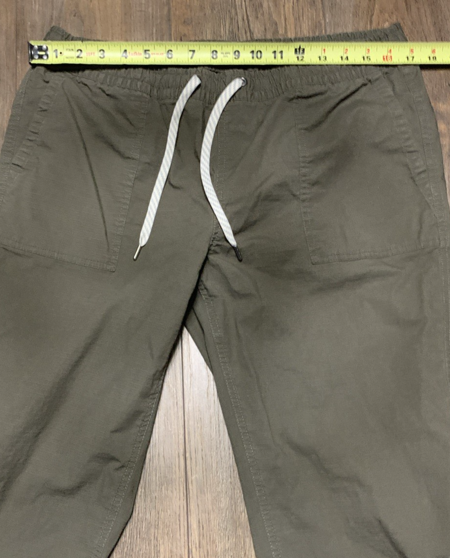 The Vuori Women's Ripstop Pants in size L are a stylish and versatile option for everyday wear. Made from comfortable cotton material with a stretch for added flexibility, these olive green pants feature a drawstring closure for a customized fit. The tapered leg style and jogger design make them perfect for travel, casual outings, or even workwear. Machine washable for easy care, these pants are a great addition to any woman's wardrobe, offering both functionality and fashion.