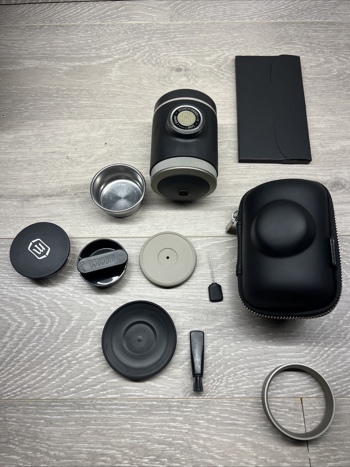 The WACACO Picopresso Portable Espresso Maker is a compact and portable espresso machine that allows you to make delicious espresso on-the-go. With a water tank capacity of 0.084 Qt and a grind coffee feature using a burr grinder, you can enjoy high-quality espresso made with ground coffee. This manual espresso maker, powered by a 18 bar pressure system, comes in a sleek black color and includes an analog control panel for easy operation. Perfect for coffee lovers looking for a convenient and easy way to enjoy their favorite espresso drinks wherever they are.