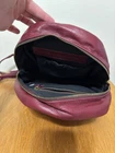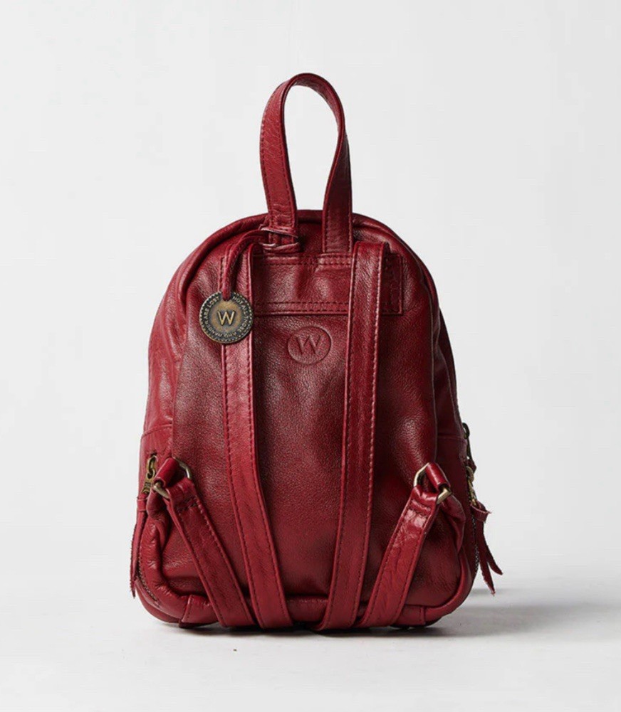 WANDERERS Travel Co Mini Californian Red Pebble Leather Bag brass zippers med size side pockets and front Small bookbag, very good used condition. Small mark on bottom of the bag, see pictures 100% leather. H 27cm x W 22cm x D 10cm (10.6" x 8.6" x 3.9") Soft full grain cow leather Weighs 0.77kg (2.5 lb.) Zippered closure 2 x external side pocket 2 x external front pocket Internal zippered pocket Internal elastic open pocket Adjustable shoulder straps - 58cm (22.8") to 83cm (32.7") Metal hardware Signature coin attached All our products are made with the best quality full grain leather. This is a natural product meaning each piece is beautifully unique. No piece will be exactly the same as another and some may have natural markings and character that should not be considered a fault.