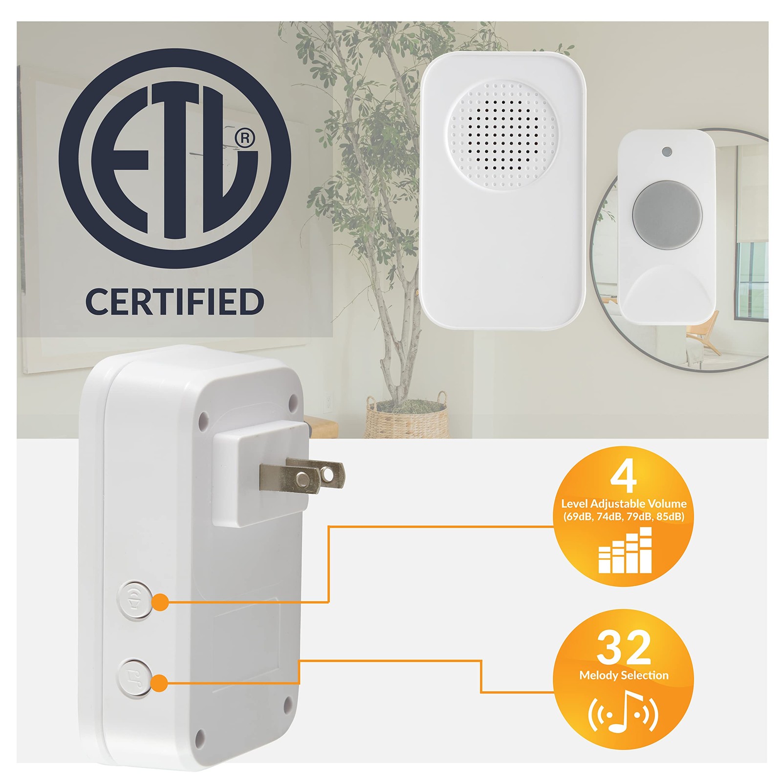 CLASSIC LOOK AND FEEL: Our Plug-In Wireless Door Chime Kit comes in a classic, elegant design that blends in seamlessly in your home. The compact white receiver has a decorator feel and plugs into any 120V outlet. LOUD AND CLEAR: You'll hear the chimes clearly and distinctly every time. Our wireless ring doorbell has an effective sound range of 150 ft without obstructions and a 4-level adjustable volume. 32 MELODIES: Choose the ring chime that suits you. Our wireless doorbell for home and office comes preset with 32 bright tones. If you decide to unplug and move it, it still remembers the tone you picked. EASY TO INSTALL: Set it up effortlessly in minutes. The plug-in doorbell receiver goes into any wall outlet. The doorbell push button comes with screws and double-sided tape, whichever you prefer. VERSATILE RINGER: You can use our wireless door bell at home, in the office reception area, in a stockroom or warehouse, as part of classroom supplies to get students' attention, and more!