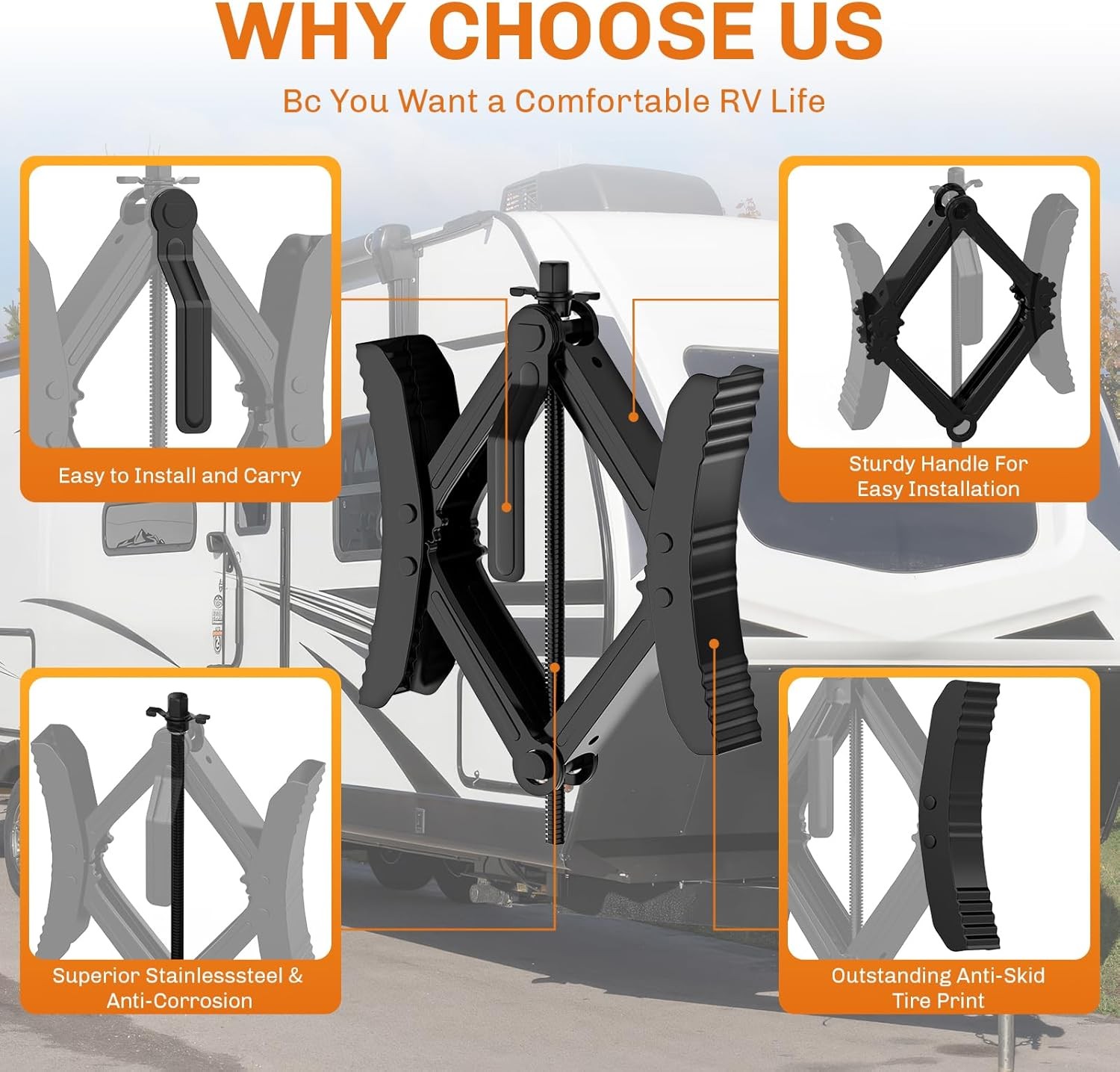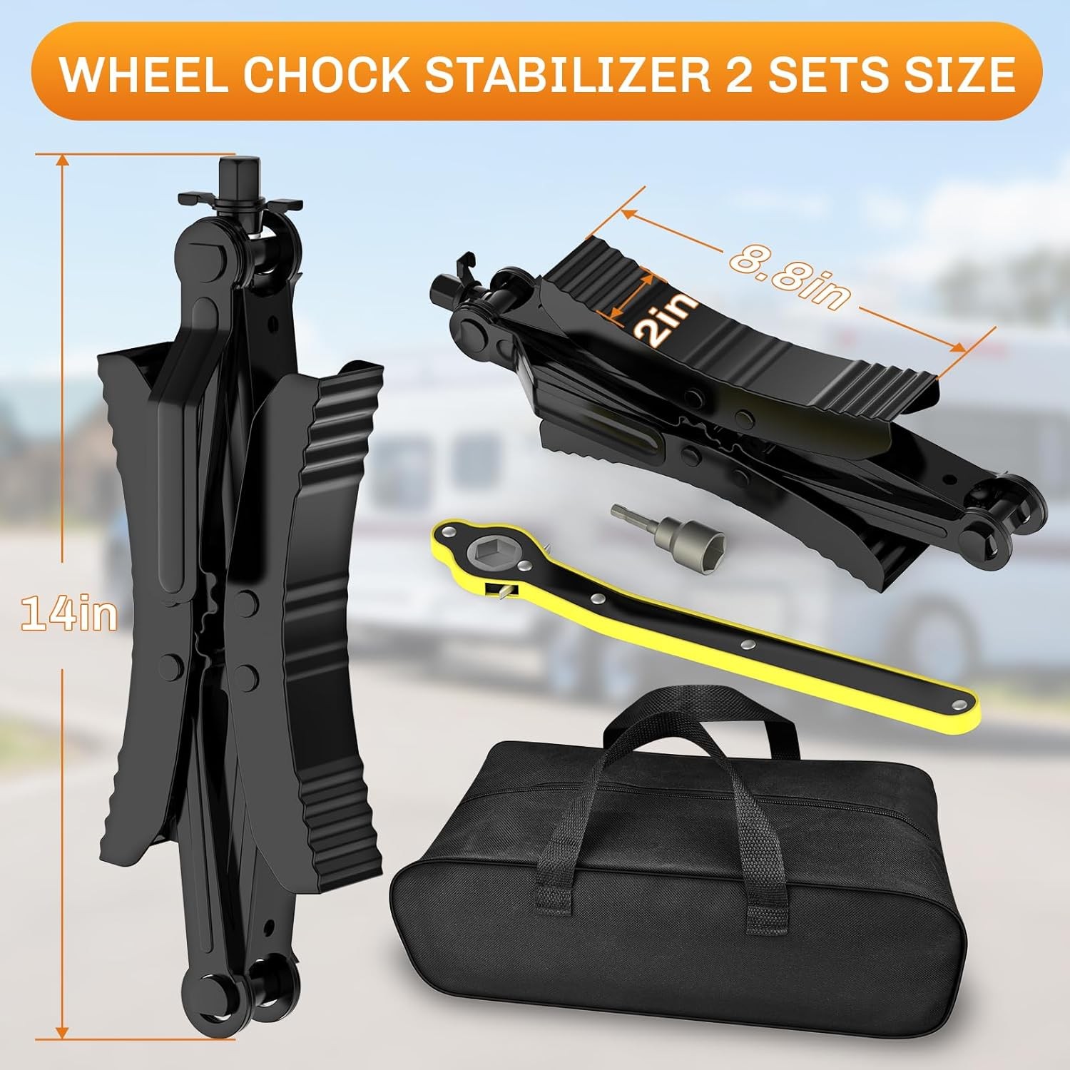 WELLUCK Camper Wheel Chock Stabilizer 2 Sets for RV Travel Trailer Heavy Duty X-Shaped RV Chocks Anti-Move Tire Wheel Chock, Fits 3.5" to 12" Wheel Gaps Product Details Manufacturer: WELLUCK Brand: WELLUCK Model: Wheel Chock Item Weight: 10 pounds Package Dimensions: 15.79 x 6.85 x 5.24 inches Country of Origin: China Item model number: PL0195 Manufacturer Part Number: Wheel Chock Reliable Camper Wheel Chocks: Our package includes two premium wheel chock stabilizers, designed to keep your RV, camper, or trailer steady and secure during your camping adventures. Compatible with wheel clearances ranging from 3.5" to 12", these chocks ensure enhanced safety and prevent unwanted movement. Innovative X-Shaped Design for Superior Stability: Crafted with a heavy-duty X-shaped structure, our wheel chocks evenly distribute weight and exert opposing forces on the tires, providing maximum stability. This unique design is engineered to withstand diverse forces and terrains, ensuring your RV stays perfectly positioned. Versatile Compatibility for All RVs & Trailers:Whether you have a small camper, a large RV, or a travel trailer, our wheel chocks are suitable for a wide range of vehicles. Perfect for various tire sizes and spacing between 3.5" and 12", these chocks provide peace of mind in all parking situations and terrains. Easy Installation & Convenient Storage: Included with the chocks are a ratchet wrench, socket adapter, and a pair of gloves for fast and easy installation. The set also comes with a compact storage bag for convenient transport and storage, ensuring your wheel chocks are always accessible and space-efficient. Built for Durability and Long-Lasting Use: Made from premium cast iron, these X-shaped wheel chocks are reinforced to endure high torque and provide a firm grip on your tires. The unique pattern increases friction, while the durable anti-rust finish protects against harsh outdoor conditions, ensuring reliable performance for years to come.