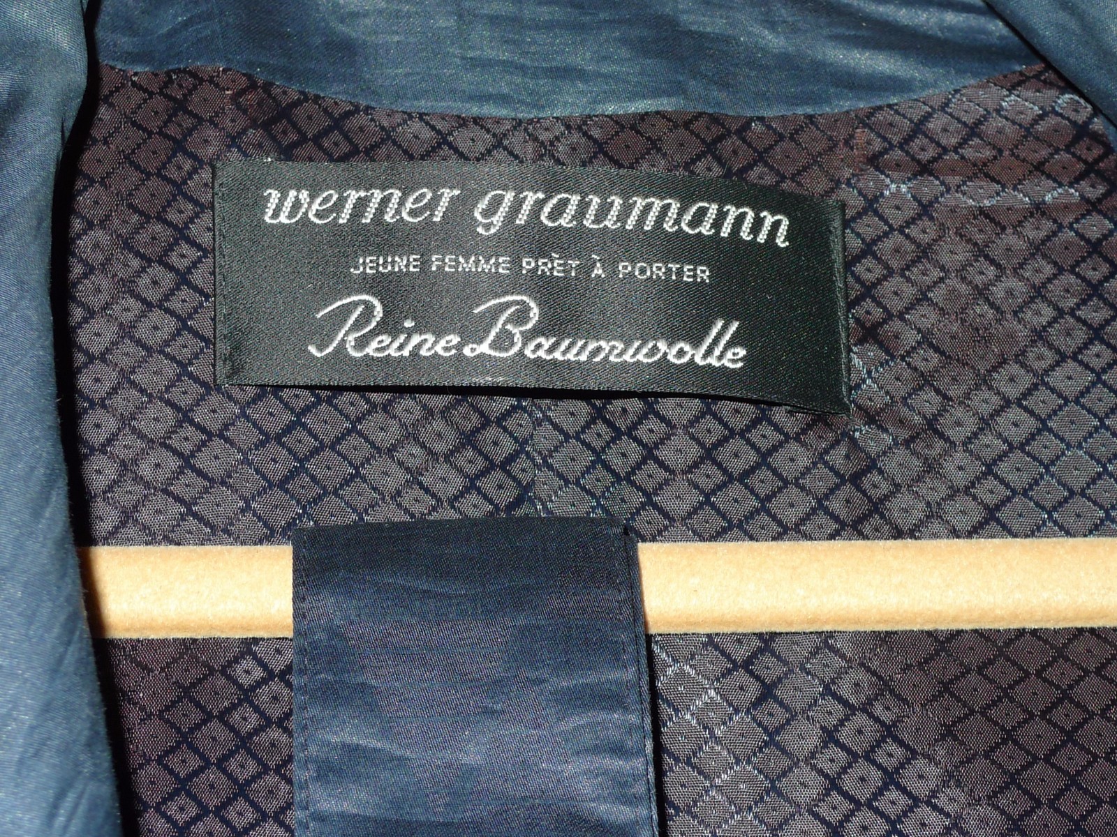 WERNER GRAUMANN JEUNE FEMME PRET-A-PORTER, DESIGNERS, BOUGHT AT A HIGH-END BOUTIQUE IN GERMANY, WOMEN'S TRENCH COAT, IN IMMACULATE PRE-OWNED CONDITION (WORN ONLY THREE TIMES), PURCHASED IN GERMANY FOR ALMOST $1900.00! COLOR - NAVY BLUE, WITH SILVER TONED BUTTONS AND A BELT. MATERIAL - 100% COTTON (ON A LABEL STATED "REINE BAUMWOLLE"). EURO SIZE 54, US SIZE APPROXIMATELY 22-24. THIS TRENCH COAT IS ABSOLUTELY BEAUTIFUL! PICTURE DOES NOT DO ANY JUSTICE! MEASUREMENTS: SHOULDER TO SHOULDER - 19 INCHES PIT TO PIT - 27 1/4 INCHES SLEEVE LENGTH - 22 1/4 INCHES TOTAL LENGTH - 48 1/2 INCHES