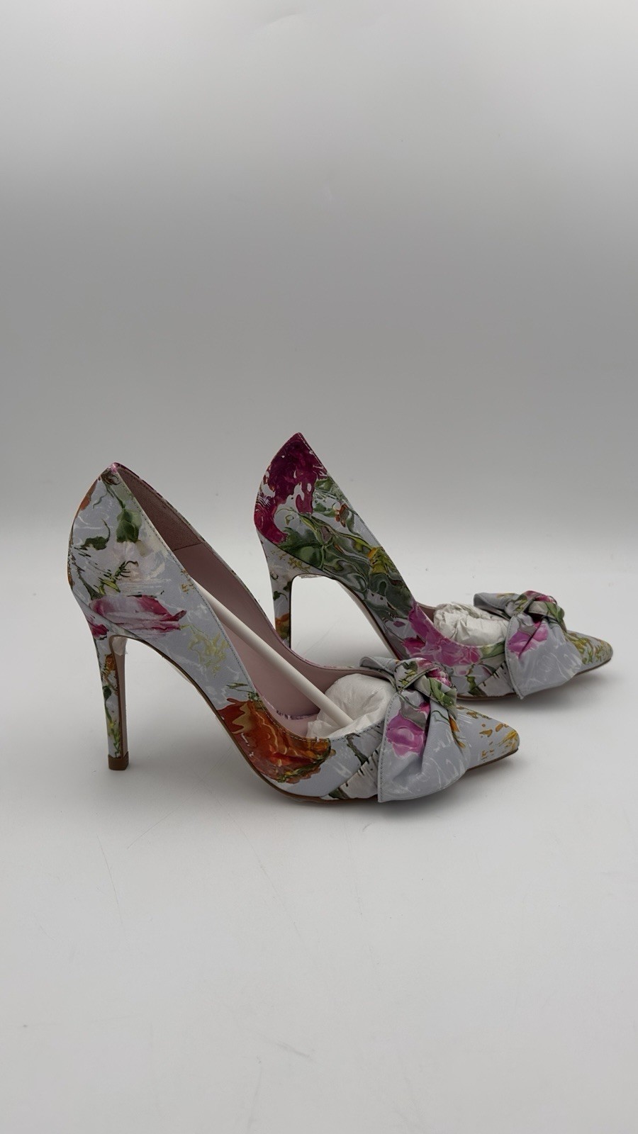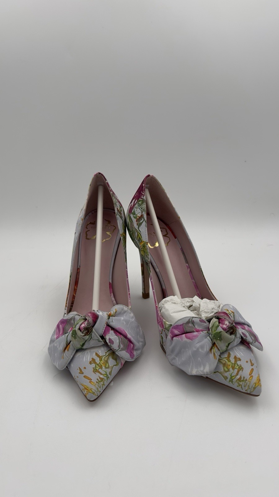 The WES-RYRYA 100MM BOW COURT Shoes by Ted Baker are sophisticated and elegant heeled shoes for women, size 38.5. Made in Spain, these ivory shoes feature a stunning bow accent, perfect for a bridal or special occasion. The resin upper material adds a touch of luxury to these stylish and chic heels, making them a statement piece for any outfit. Perfect for adding a touch of glamour and sophistication to any ensemble.