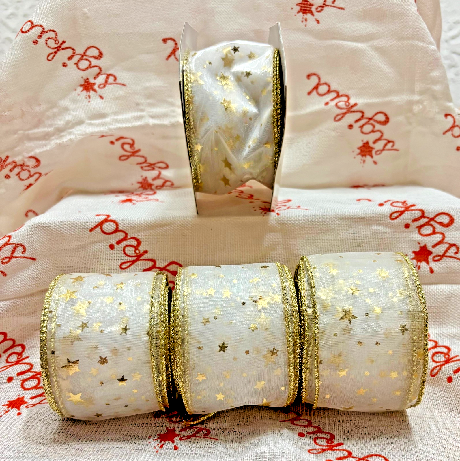 Christmas Wired Ribbon Garland Tree Trim . White Ribbon with Gold Stars & Gold Dots. The spool has never been opened and the other 3 may have been used. They appear unused? I do not ship outside of the USA. Thanks for looking. Please contact me with any questions. I ONLY MAIL IN THE UNITED STATES I ONLY ACCEPT PAYPAL - BE SURE YOUR ADDRESS IS CORRECT ****** ALL SALES ARE FINAL