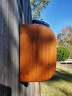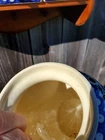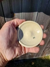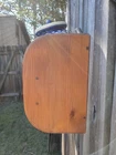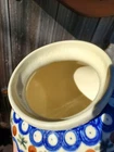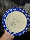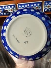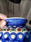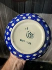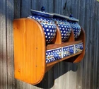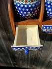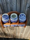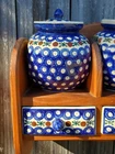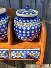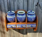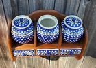 These wall mount WIZA Polish Pottery Canister sets are somewhat hard to find. I have only seen one for sale, recently. They are out of stock on the polish pottery websites. The shelf is crafted from Clear Pine and stained with a light wood finish. The shelf holds 3 large canisters, 2 of which have lids. The shelf also has 3 pull out drawers for storing tea bags, etc. The bottom of the shelf has 3 wooden pegs for hanging utensils or maybe decorative towels. The polish pottery pieces are from the "Mosquito" pattern hand made by the Wiza factory in Boleslawiec, Poland. The wood shelf itself measures approx. 16.75" wide x 14" tall x 6.5" deep. The wood is clear pine meaning it has little to no knots in the grain pattern. There are 2 drilled holes for mounting the shelf to the wall. Overall, this set is in very good condition. A few of the pottery pieces do have some crazing and I have tried to represent that in my pictures. One canister has a chip at the very top lip and a hairline crack that runs down the front of the canister. I have included a picture. The middle canister does not have a lid. You can use it as it or pickup a replacement lid. Let me know if you have any ??? or need any additional information. Cheers!