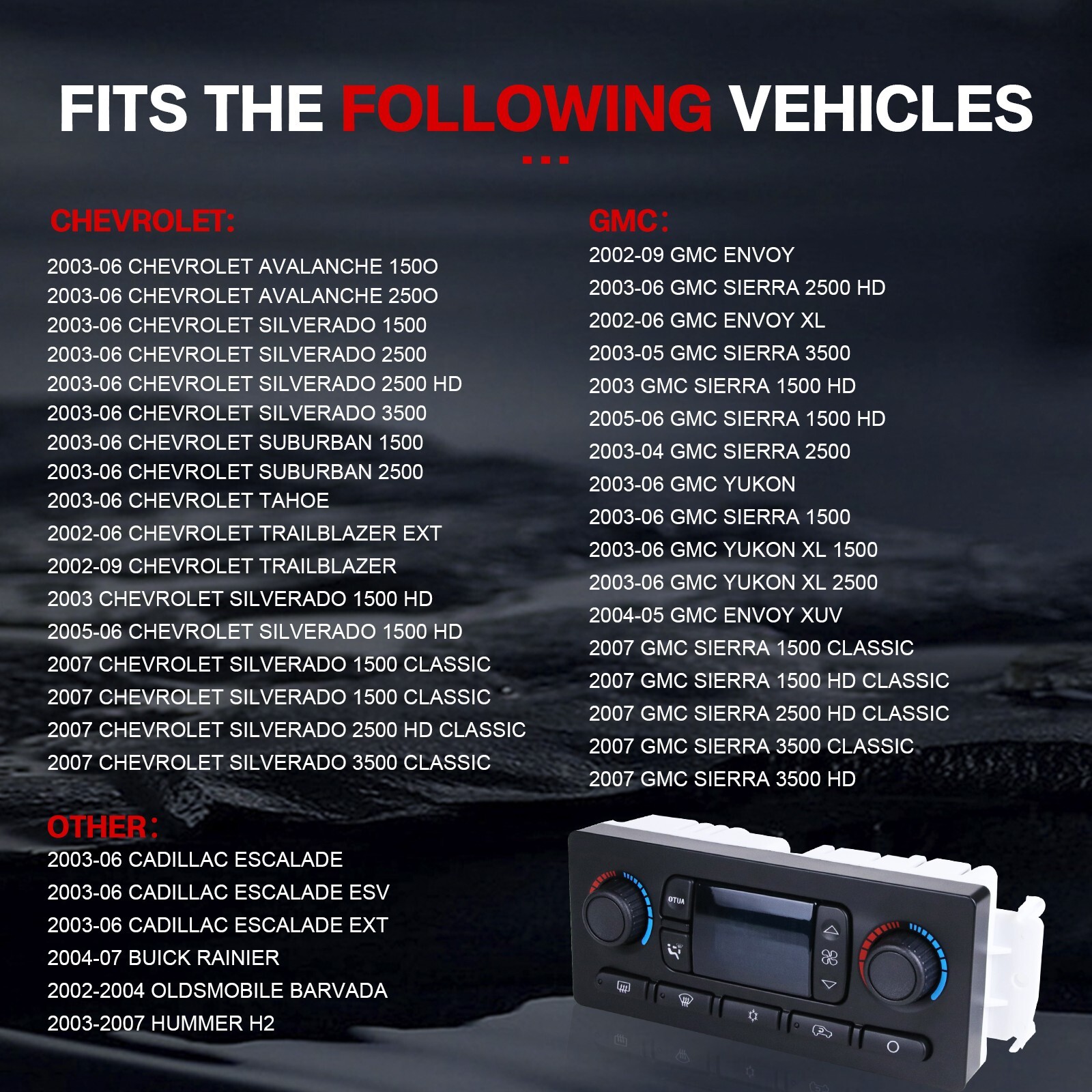 Store Categories Store Categories High Pressure Fuel Pump Liftgate Actuator Struts Oxygen Sensors Rear View Backup Camera Climate Control Panel Tire Press Monitoring System Master Power Window Switch Battery Current Sensor Shock Struts Suspension Fuel pump assembly Solenoid valve wiring harness Radiator Camshafts Throttle Bodies DEF PUMP Vacuum Pumps Door Handles Fuel Injectors Other Cowtotal Autoparts,Your Best Aftermarket DIY & DIFM Partner. Product Description Pa cka g e includes: 1 x HVAC Control Module Fitme nt : (For Reference Only): If you are not sure, please feel free to contact the seller For 2003 Hummer H2 For 2006-2007 Hummer H2 For 2004 2005 2006 2007 Buick Rainier For 2002 2003 2004 0ldsmobile Bravada For 2005-2006 Cadillac Escalade EsV For 2005-2006 Cadillac Escalade EXT For 2006 Chevrolet Tahoe For 2005 2006 Chevrolet Trailblazer For 2005 2006 Chevrolet Trailblazer EXT For 2005 2006 Chevrolet Avalanche 1500 For 2005 2006 Chevrolet Avalanche 2500 For 2005 Chevrolet Silverado 1500 For 2005 2006 Chevrolet Silverado 1500 HD For 2005 Chevrolet silverado 2500 For 2005 2006 Chevrolet silverado 2500 HD For 2005 2006 Chevrolet silverado 3500 For 2005 2006 Chevrolet suburban 1500 For 2007 Chevrolet Silverado 3500 Classic For 2005 2006 2007 2008 2009 GMC Envoy For 2005 2006 GMC Envoy XL For 2005 2006 GMC Sierra 1500 For 2005-2006 GMC Sierra 1500 HD For 2005 2006 GMc Sierra 2500 HD For 2005 GMC Sierra 3500 For 2005 GMC Envoy XUV Features: 100% Brand New. According to o riginal factory specifications, perfect match to original car . Made of high quality material. Parts are from certified professional factory. Specifications: Interchange Part Number:599-211XD, 599211XD, 599-211, 599211 OE/OEMPartNumber:10367041, 10367042, 10399657, 15077479, 15079112, 15085358, 15105215, 15105969, 15107730, 15132070, 15133519, 15136332, 15137655, 15165918, 15175897, 15185639, 15192450, 15195331, 15195380, 15195564, 15201969, 15202099, 15203179, 15214766, 15220310, 15220319, 15222482, 15763065, 15814152, 15832311, 15832314, 15832316, 15832318, 15845093, 15855848, 15855849, 21997426, 21997427, 21998695, 21999159, 21999163 Manufacturer Part Number:599-211xd Connector Quantity: 2 Housing Color: Black Mounting Hardware Included: No Mounting Type:Bolt On Note: Pleas e Check Carefully To Make Sure the OE Number And Picture are Exactly Listed Are The Same As Your Orignal One. If You are Not Sure Whether It Fits, Please send VIN number to us. No Instruction Included, professional installation is highly recommended . Payment Policy Shipping Policy Returns Policy Warranty Payment Policy 1. We accept Paypal, Credit Card, Veno,Goggle Pay,American Express,Discover, Direct Debit, VISA, eCheck, or othe r methods, please kindly check Paypal for more information. 2. For multiple purchases, please add items to your Ebay shopping cart and pay once for entire order. Shipping Policy 1. All items will be shipped to buyer's ebay address. 2. All items will be shipped within 24 working hours upon receipt of payment, and multiple items might be combined shipping. 3. In most cases, delivery takes around 3-7 business days, it's highly depended on the efficiency of the shpping carrier. If your item doesn't arrive on time, please contact us immediately for further assistance. Please note there is no local pickup service available. 4. We do appreciate your purchase here. If you are astisfied with the item as well as our service, please kindly leave us a Positive Feedback to help develop our bu siness. Th ank you in advance. Returns Policy We have a friendly and dedicated customer support teams to handle any problems you come up with our products. Please contact us first via email or message for replacement, refund or technical problem caused by any reason. Warranty 30 Days Free Return and Money Back Guarantee. If you are not satisfied with your purchase, you can return the item with original packaging back to us for full refund, not any re-stock fee. The return cost should be paid by buyer. 5 Year Unl imited Mileage Quality Guarantee If you receive any w rong items, or damage during the transportation or defect items, we will accept the return and pay the return freight. Please noted that the return cost should be prepaid by buyer, we will issue the refund of return cost to buyer after inspecting the faulty item. The full refund or replacement will be available for all faulty items, including the original shipping cost. Please kindly contact us b efore return, our representatives will send you the detailed return instruction. The guarantee will be only for the cost of the item, we will not responsible for installation or other fees like labor expenses, towing expenses, additional repair expenses or other related expenses. Copyright © 2023 Dianxiaomi