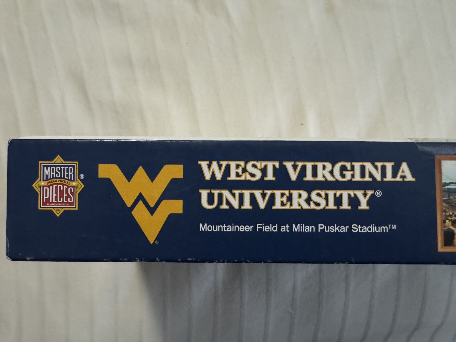 The product is a 1000-piece jigsaw puzzle for adults featuring a panoramic view of Mountaineer Field in team colors. It is made by MasterPieces and measures 13" by 39" when completed and weighs 1.4 pounds. The package dimensions are 15.98 x 7.91 x 2.2 inches.