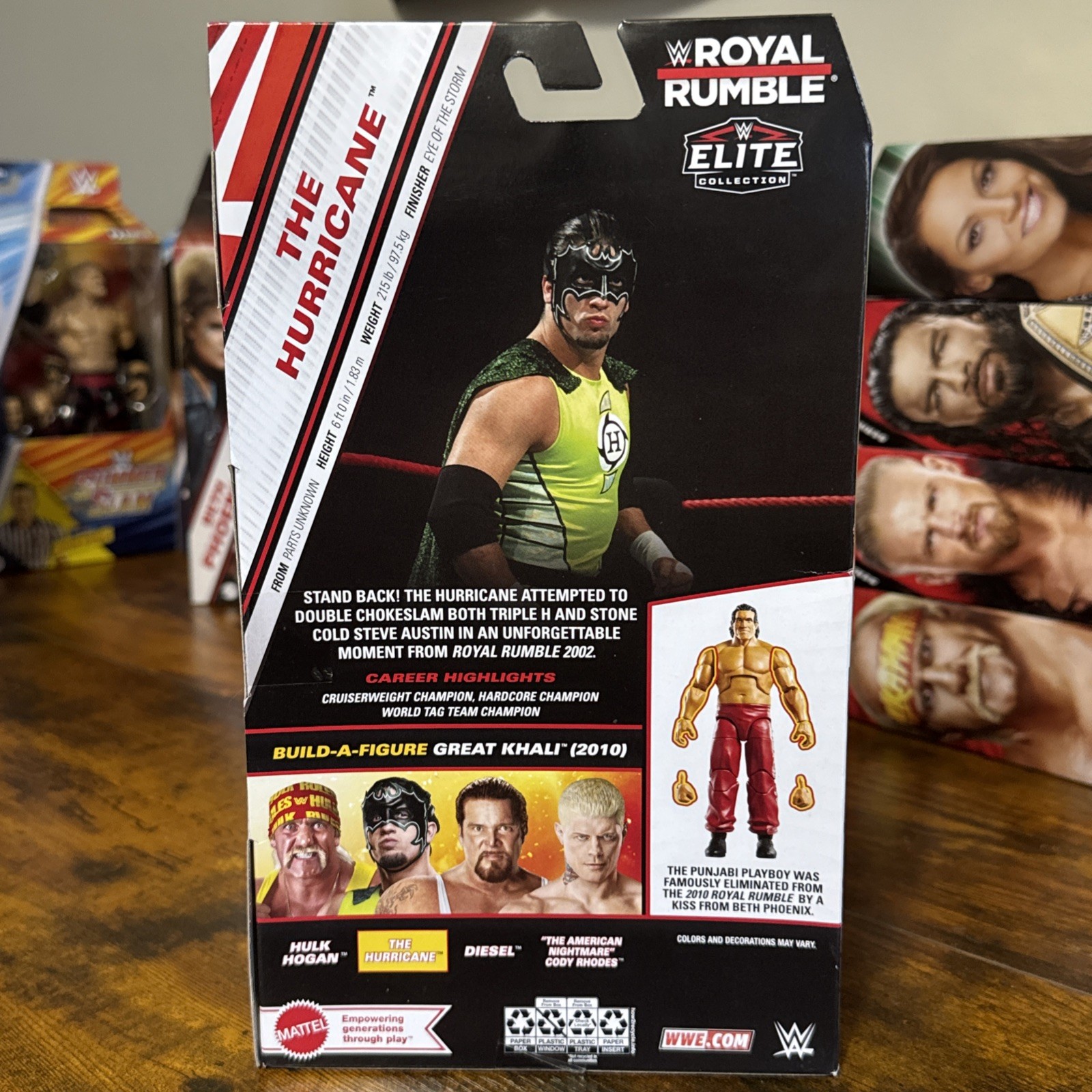The Mattel WWE Elite Royal Rumble Collection The Hurricane Action Figure is a 6-inch toy representing the wrestler The Hurricane from the World Wrestling Entertainment (WWE). This figure includes an extra set of hands, build-a-figure piece from Great Khali's arms and hands, and a removable cape. It is part of the WWE Elite Collection series and comes in its original packaging from 2024, with a multicolor design and adjustable features. Perfect for collectors and fans of wrestling, this action figure is a must-have for anyone looking to add to their WWE memorabilia.