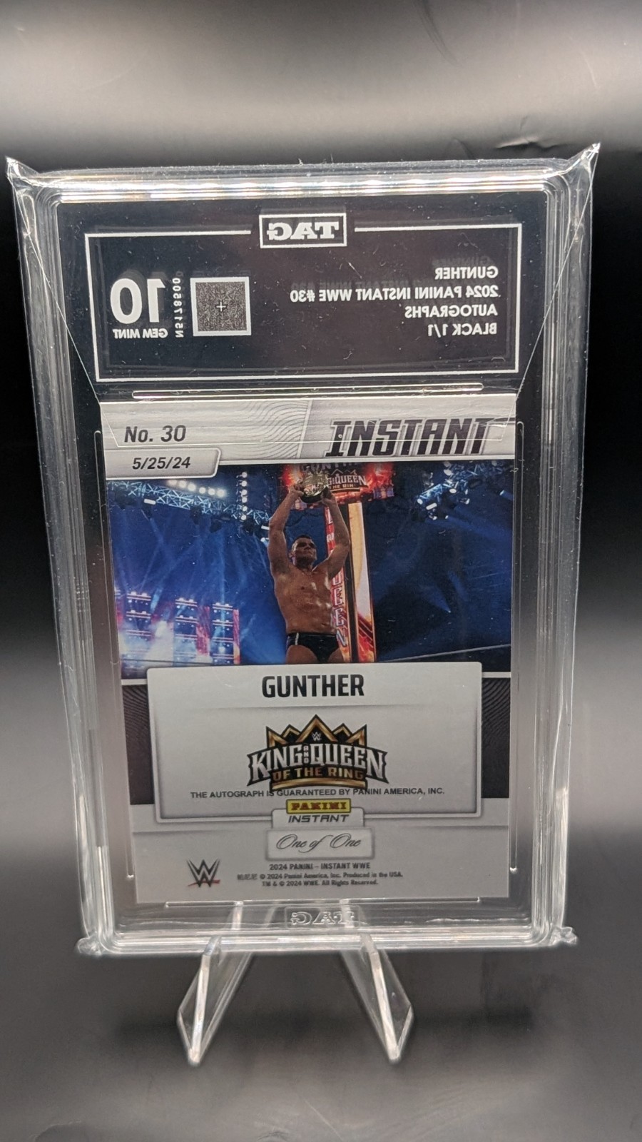 Tauchen Sie ein in die Welt des Wrestlings mit der exklusiven WWE Gunther Auto One of One 1/1 King of The Ring Panini Instant Trading Card. Diese begehrte Sammelkarte, herausgegeben vom renommierten Hersteller Panini, ist ein Muss für jeden Fan und Sammler. Mit ihrer "One-of-One"-Besonderheit ist sie ein wahrer Schatz und ein Highlight für jede Sammlung. Die Karte zelebriert Gunthers Erfolg bei der King of The Ring-Wettbewerb und ist ein zeitloses Andenken an seine beeindruckenden Leistungen im Ringen. Vervollständigen Sie Ihre Kollektion mit diesem einzigartigen Stück, das sich durch seine Exklusivität und den prestigeträchtigen Hintergrund der WWE-Liga auszeichnet. Ein unverzichtbares Sammlerstück, das die Leidenschaft für den Sport und die Bewunderung für Gunthers Talent in der Ring glänzt. Verpassen Sie nicht die Gelegenheit, dieses 1/1 Sammelkarten-Exemplar Ihr Eigen zu nennen.