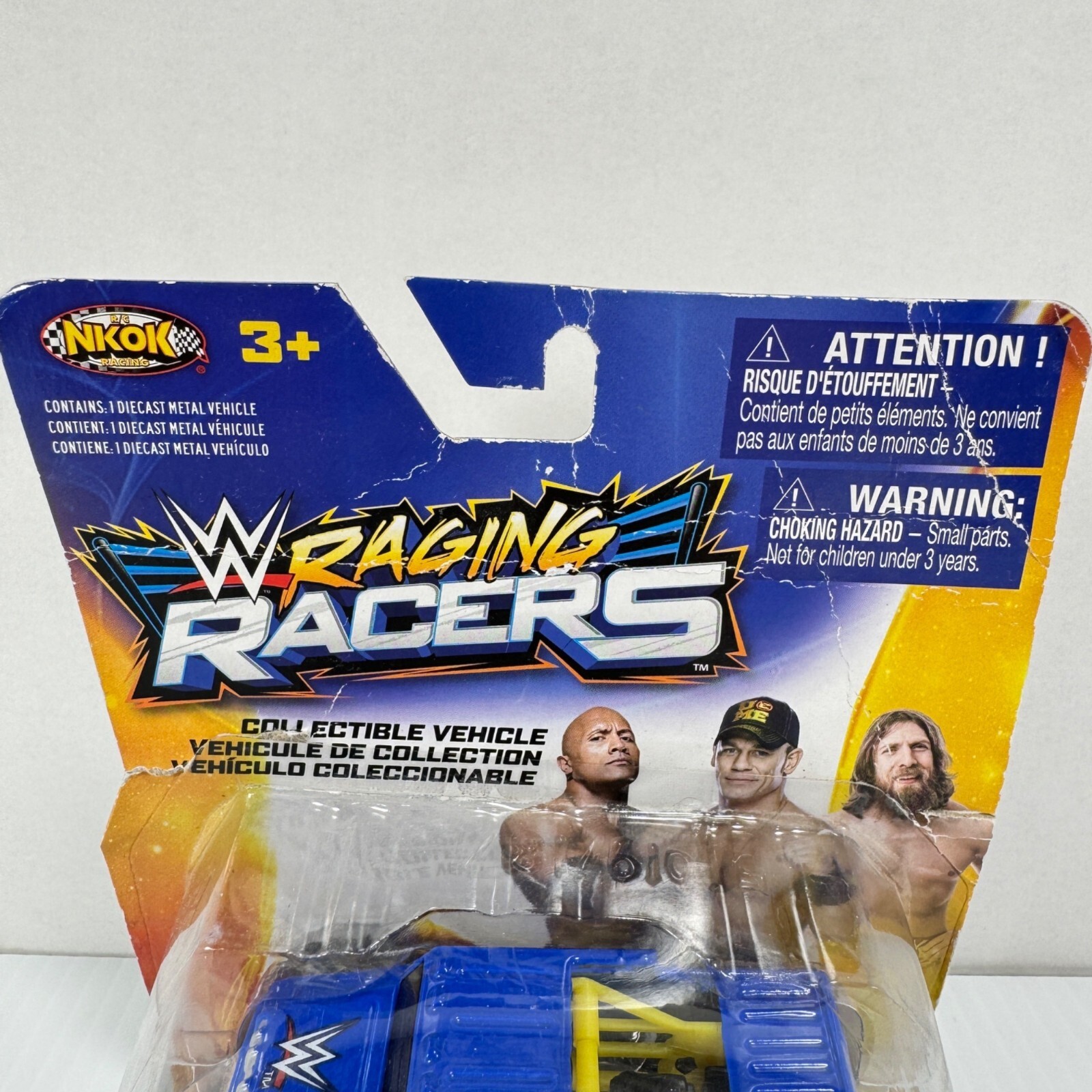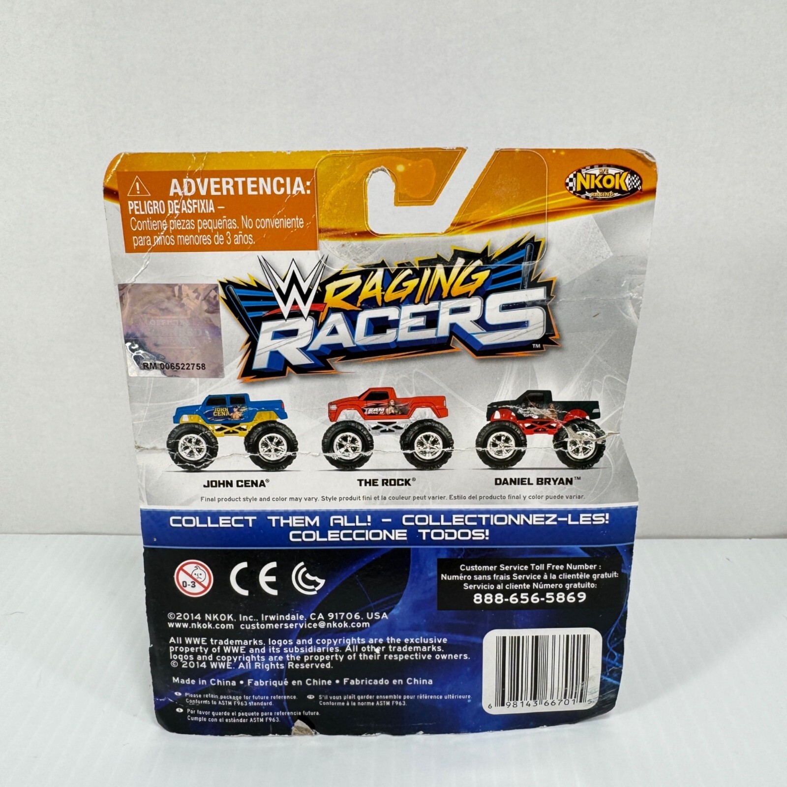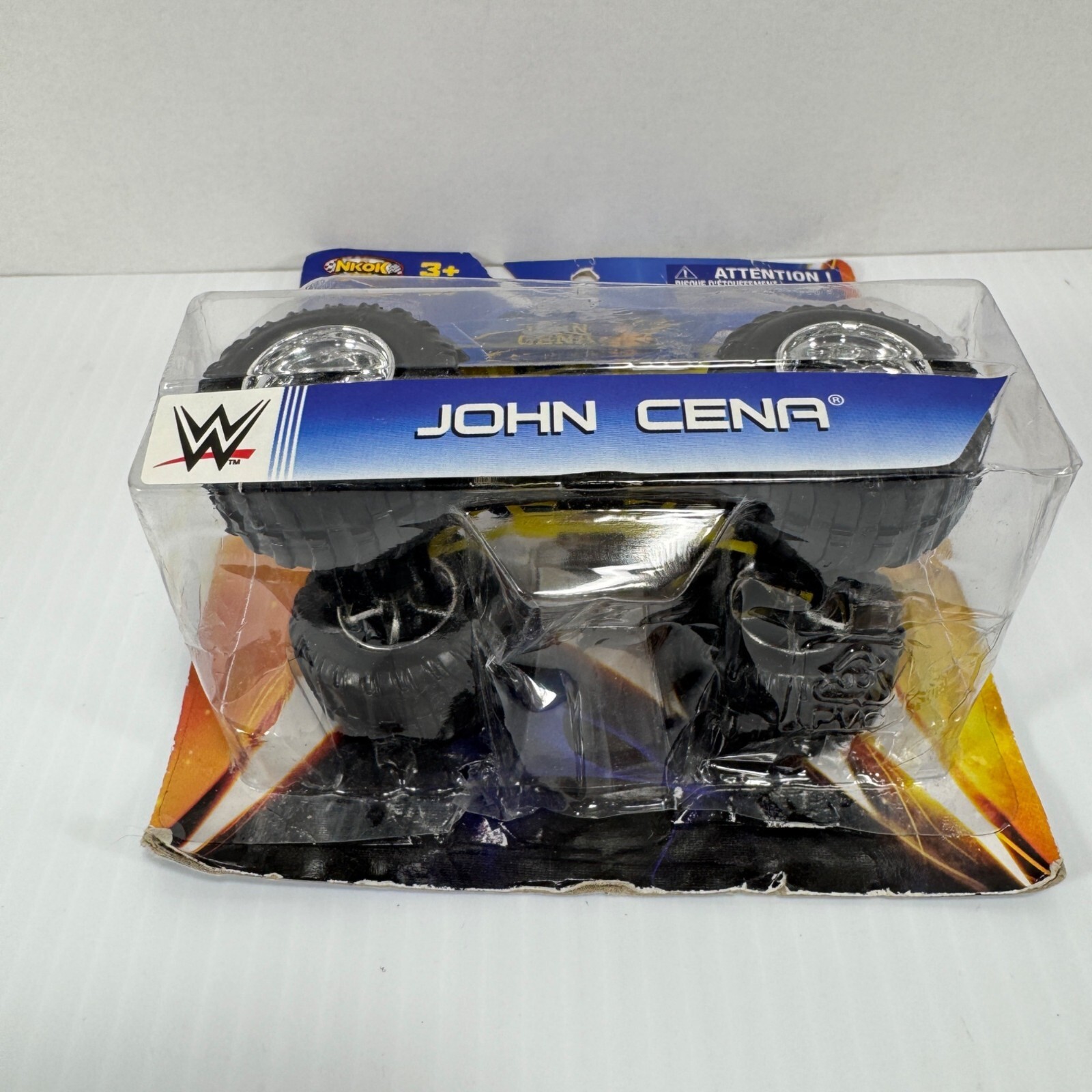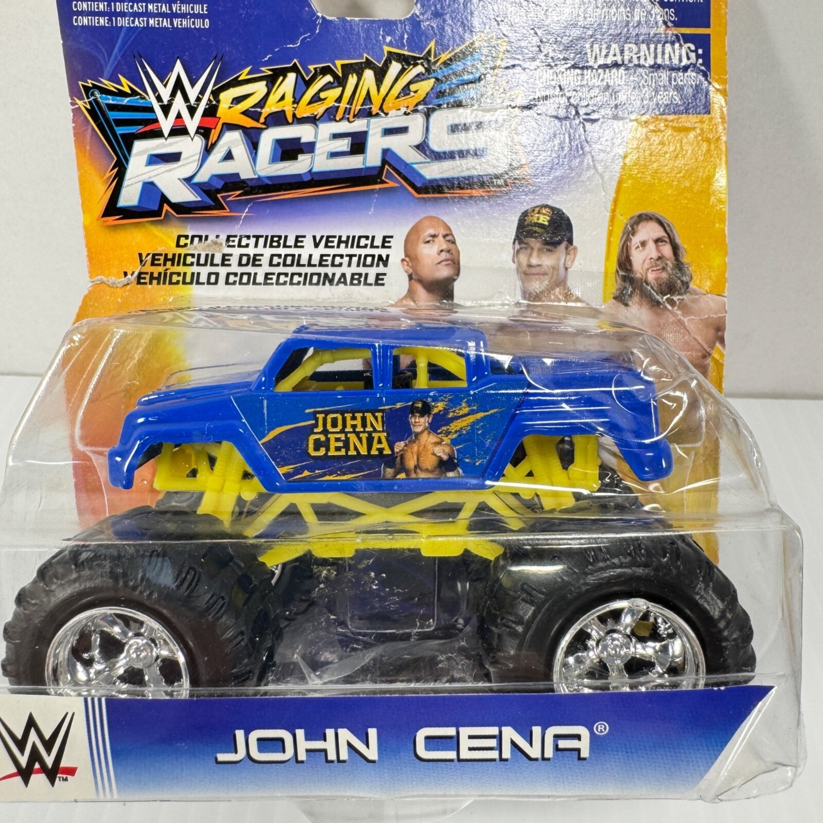 A diecast monster truck featuring WWE's John Cena. • Official WWE Raging Racers collectible • Sturdy diecast metal and plastic parts • Suitable for ages 3 and up • Features John Cena branding and design • Includes oversized monster truck wheels Never opened but the package has wear and creasing all over.