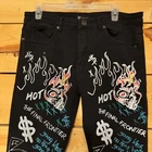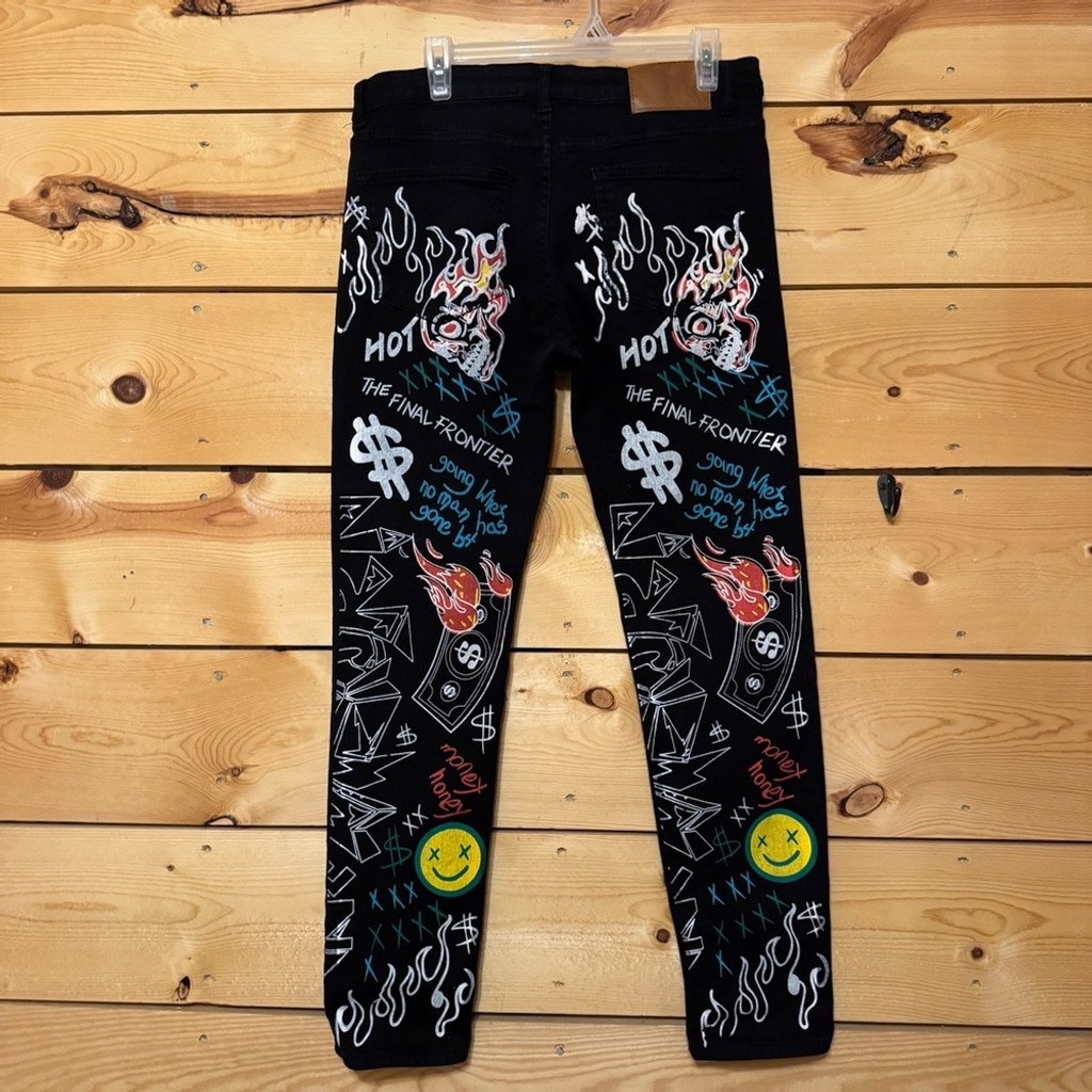 Waimea Men’s Black Skinny Fit Graffiti Jeans 34x30 #A Unique men’s skinny fit jeans by Waimea featuring bold graffiti-inspired allover print including flames, skull graphics, dollar signs, smiley faces, and phrases like “The Final Frontier.” These black jeans are crafted from a cotton-spandex blend for comfort and stretch. Tag size 34x32, actual measurements 34x30. Good used condition. Waimea, Men’s Jeans, Skinny Fit, Graffiti Jeans, Streetwear, Black Jeans, Printed Jeans, Graphic Jeans, Skater Style, Urban Fashion, Size 34, 34x30, Stretch Jeans, Glow Party, Punk, 80’s Rap Style, Unisex