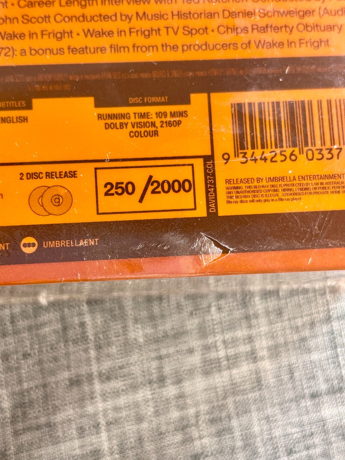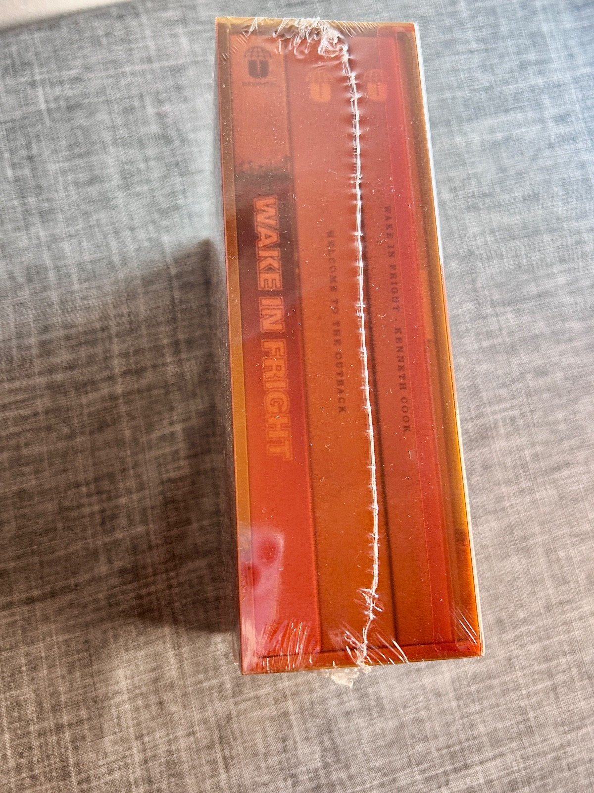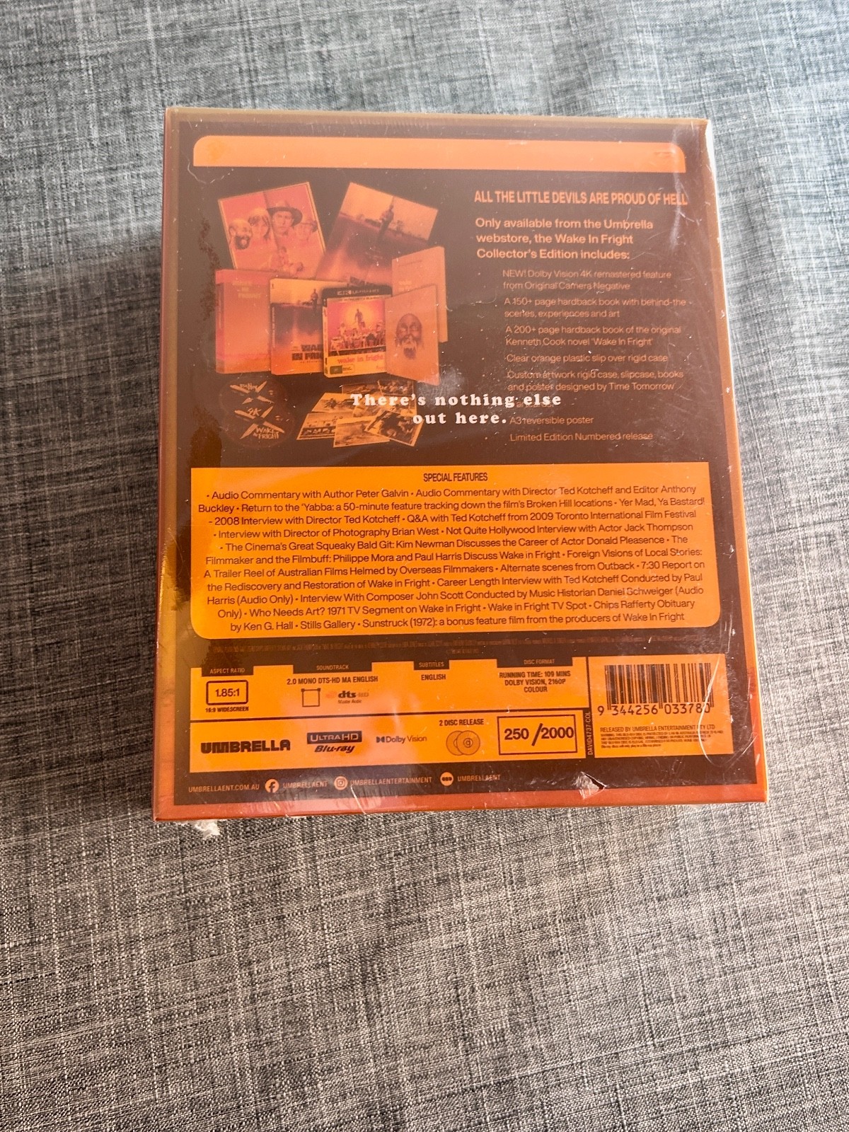 UMBRELLA ENTERTAINMENT- REGION FREE DISCS #250/2000 THE YABBA - Wake In Fright Collector's Edition includes: NEW! Dolby Vision 4K remastered feature by Umbrella Entertainment from Original Camera Negative A 150+ page hardback book with original screenplay, artwork, experiences, essays by Anthony Buckley, Peter Galvin, Gregory Marks and Paul Harris plus an in depth analysis by Tina Kaufman A 200+ page hardback book of the original Kenneth Cook novel 'Wake In Fright' Clear orange plastic slip over rigid case Custom artwork rigid case, slipcase, books and poster designed by Time Tomorrow 8 artcards A3 reversible poster Limited Edition Numbered release Raw and uncompromising in its depiction of Australian masculinity and country culture, Ted Kotcheff's WAKE IN FRIGHT is a unique horror film - equal parts an ode to the outback and a nightmarish descent. Featuring iconic performances from an ensemble that includes Chips Rafferty, Jack Thompson and Donald Pleasance, experience the horrifying and captivating WAKE IN FRIGHT, one of Australia’s most legendary and valuable contributions to film. Proudly presenting Umbrella's newly restored WAKE IN FRIGHT in glorious 4K Dolby Vision with authoring by Fidelity in Motion. Raw and uncompromising in its depiction of Australian masculinity and country culture, Ted Kotcheff's WAKE IN FRIGHT is a unique horror film - equal parts an ode to the outback and a nightmarish descent. Featuring iconic performances from an ensemble that includes Chips Rafferty, Jack Thompson and Donald Pleasance, experience the horrifying and captivating WAKE IN FRIGHT, one of Australia’s most legendary and valuable contribution to film.