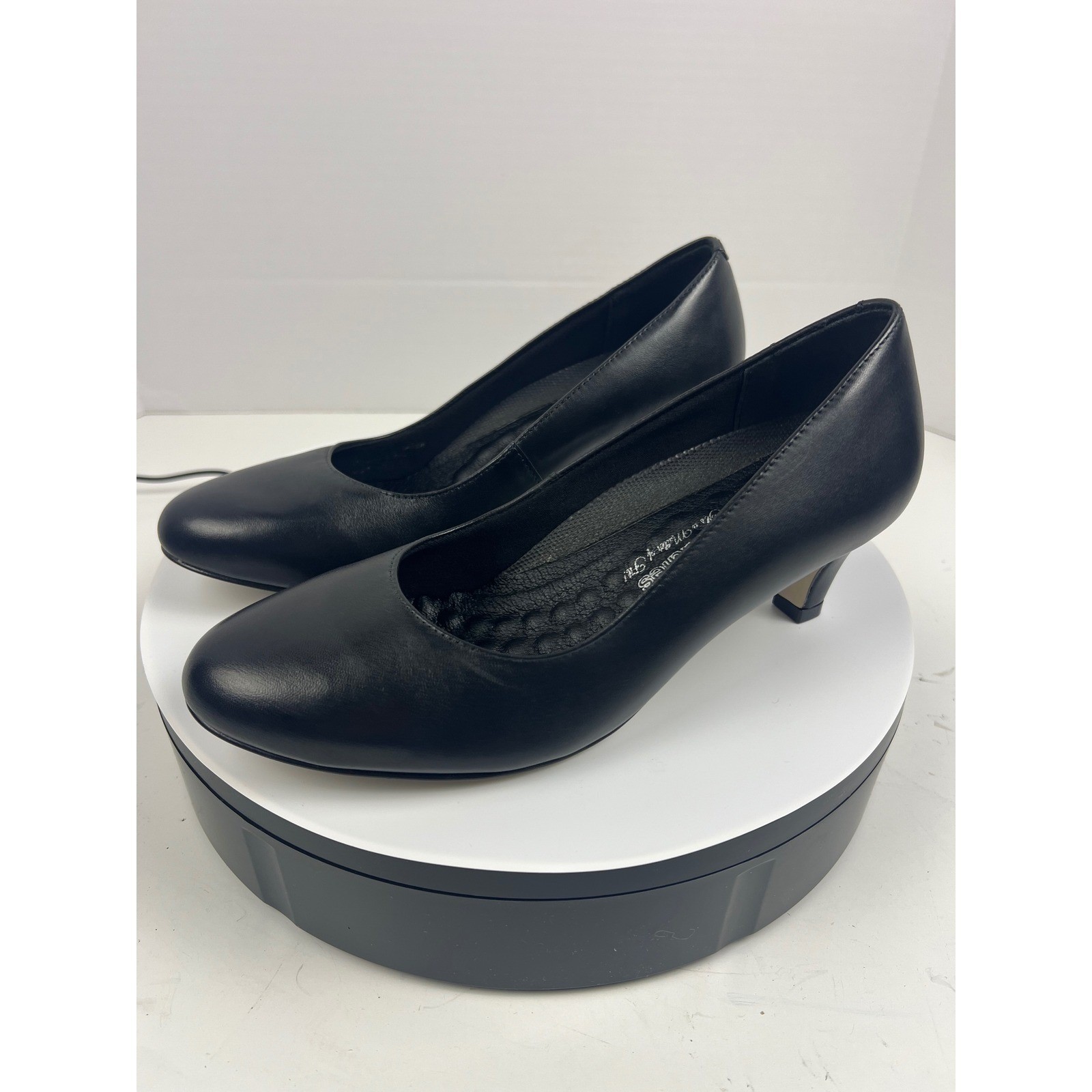Elevate your professional wardrobe with these sophisticated Walking Cradles pumps. Crafted from supple black leather, these shoes offer timeless elegance and exceptional comfort for all-day wear. The subtle low heel provides just the right amount of lift, making them perfect for important business meetings, elegant dinners, or stylish everyday outings. Style: Pump Department: Women Upper Material: Leather Heel Style: Kitten Type: Heel Toe Shape: Closed Toe Pattern: Solid Heel Height: Mid (2-2.9 in) Closure: Slip On Features: Padded, Cushioned Insole Material: Leather Outsole Material: Synthetic Lining Material: Leather Keywords: classic, comfort, dress shoes, workwear, business casual, evening, versatile, sleek, professional, stylish, genuine leather, smart