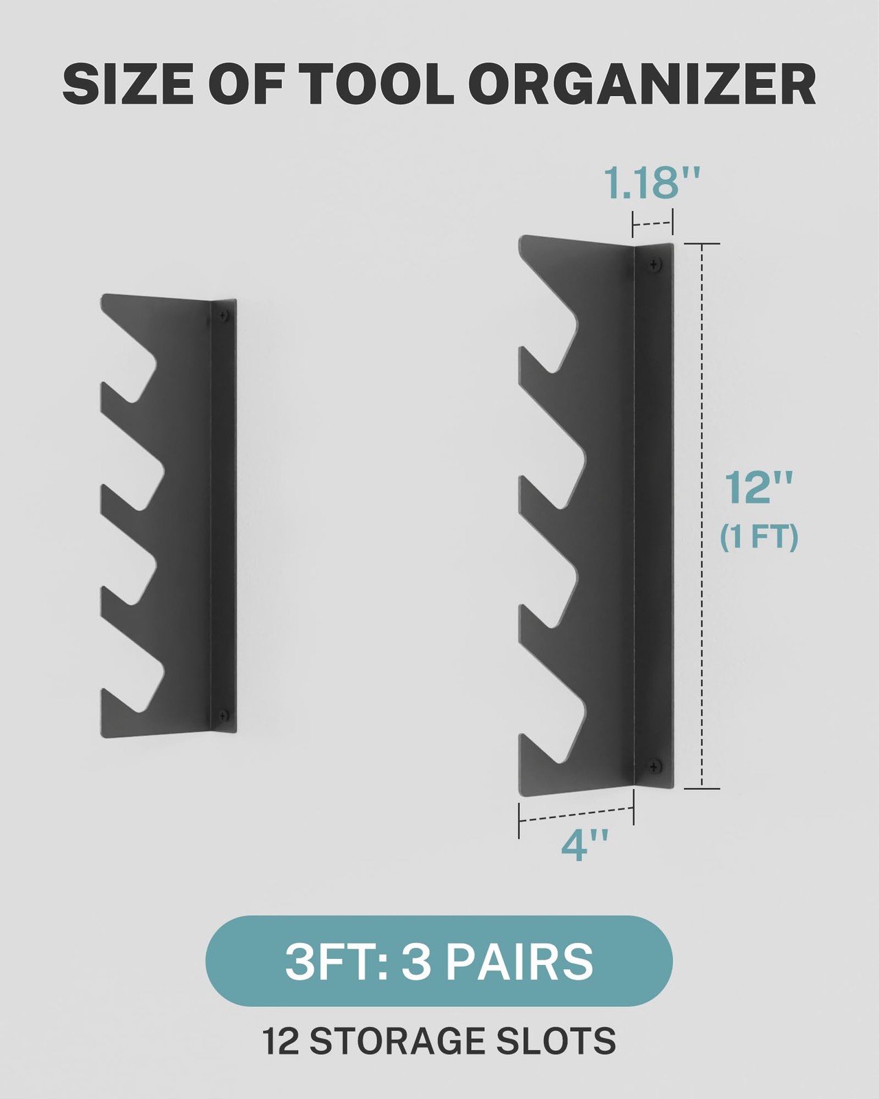The design of the horizontal tool rack makes organizing and accessing tools exceptionally convenient.The open design of the tool rack makes the tools clearly visible, allowing users to quickly find the tools they need. This reduces the time spent searching for tools during work, enhancing overall workflow efficiency. The fixed placement of tools ensures that they can be easily returned to their designated spots after use, helping to keep the workspace tidy and preventing tools from being lost or damaged. Hold up to 12 tools. Horizontal garage wall organizer: The horizontal tool rack's design makes organizing and accessing tools convenient. Its open structure allows for easy visibility, enabling users to quickly find the tools they need, thus improving workflow efficiency. Fixed tool placements ensure easy return after use, keeping the workspace tidy and preventing tool loss or damage Compact Space-Saving Design: Garage organizer keeps your shovels, rakes, brooms, and yard tools off the ground, promoting a tidy workspace while ensuring your tools remain in optimal condition and ready for your next project Ultra Heavy-Duty Construction: Crafted from thick, solid steel, tool racks for garage walls is built to last. Its industrial-grade, powder-coated finish provides exceptional durability, supporting up to 100 lbs for secure storage of your most essential tools Smart Storage Slots: Featuring four angled storage channels with an offset design, this organizer prevents tools from clashing and tangling. The slots accommodate most long-handled garden tools for easy access and efficient organization Quick and Easy Installation: Designed for straightforward mounting, this tool organizer can accommodate various stud spacings. Complete with high-quality hardware, it ensures maximum strength and stability for your garage or shed