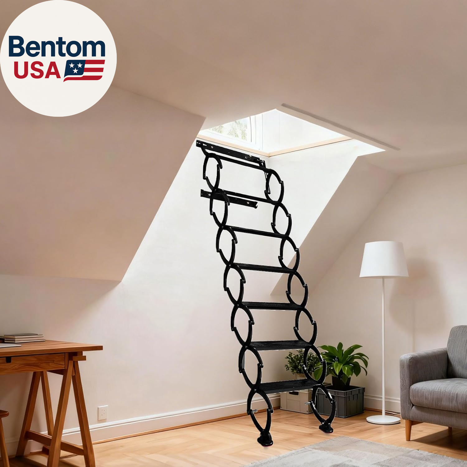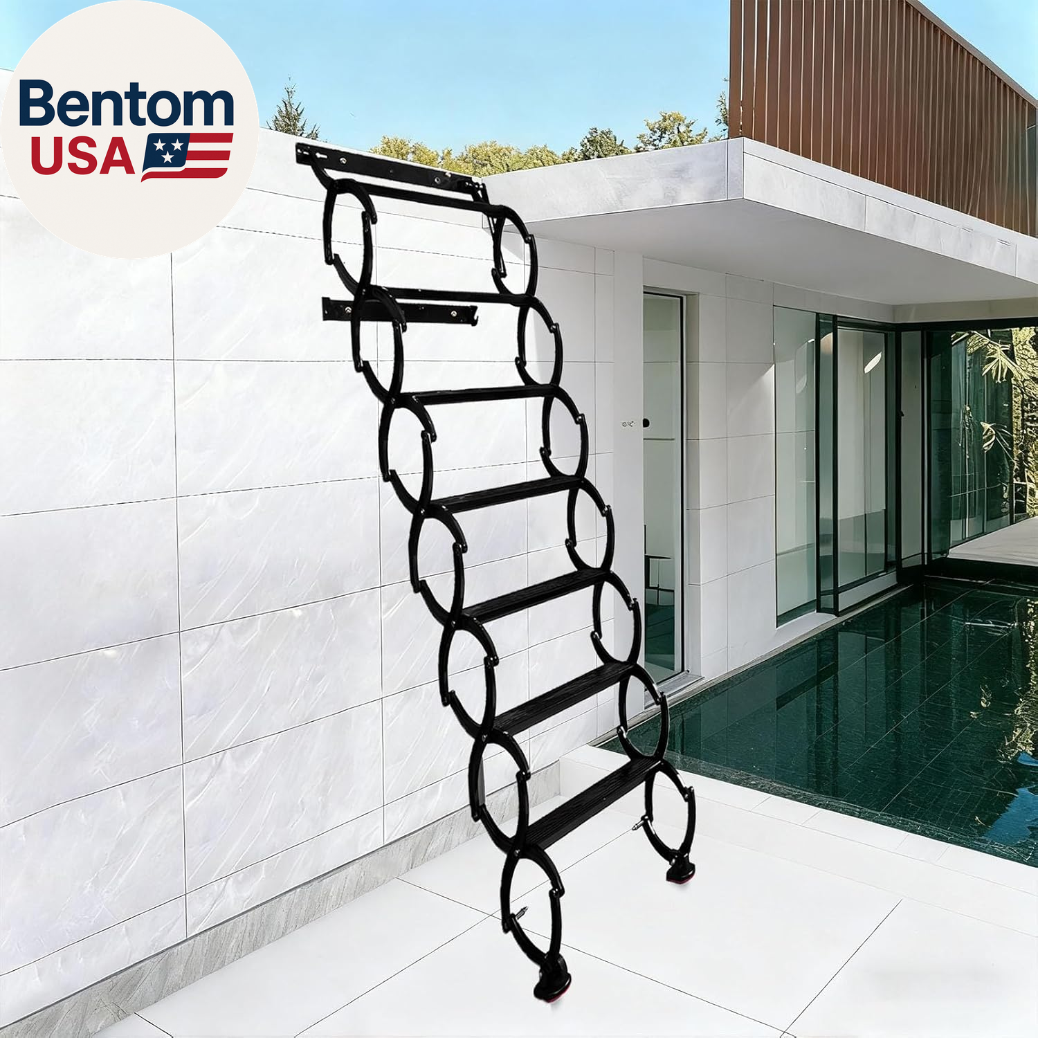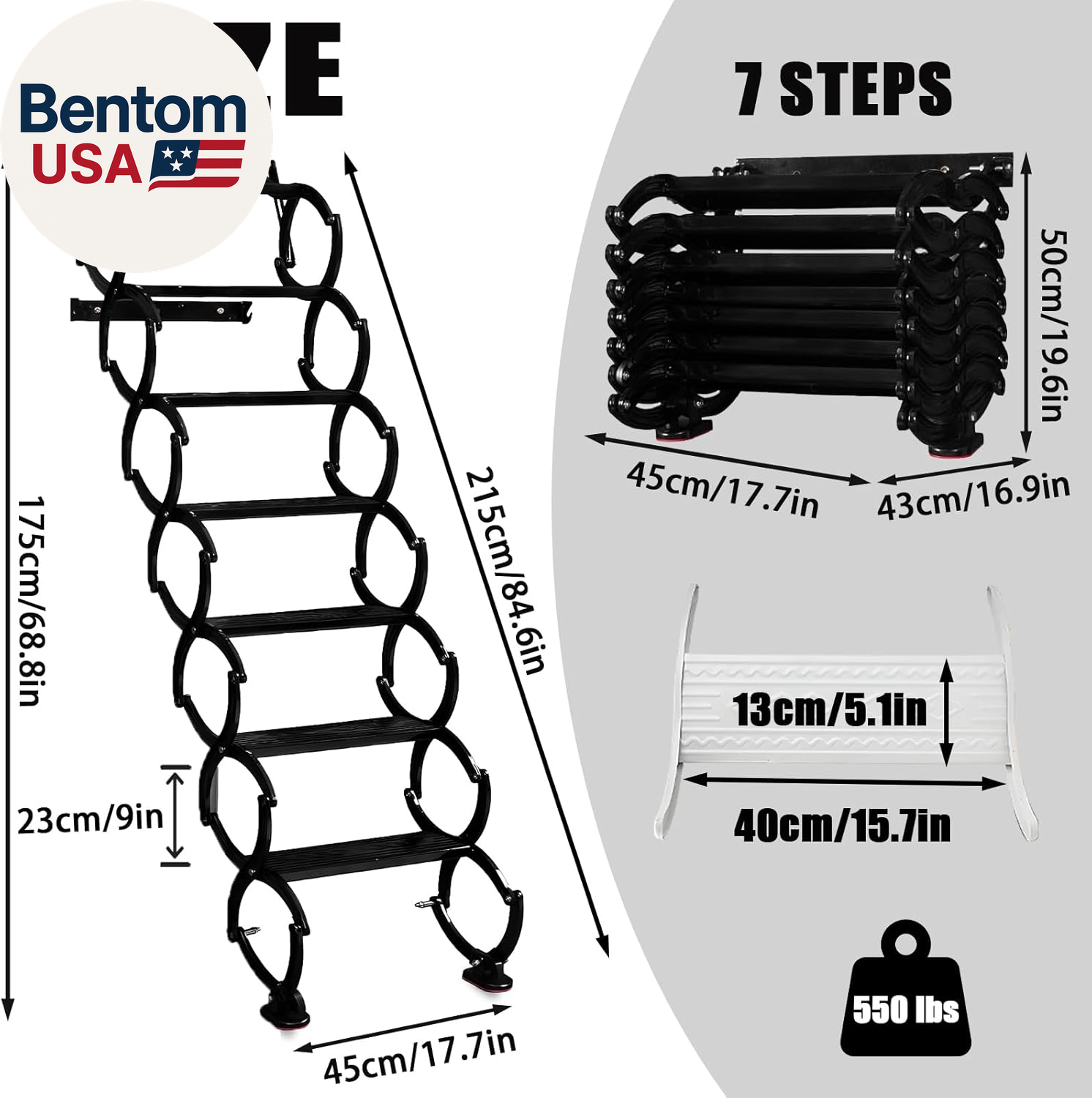 [Space-Saving Design] This telescopic folding ladder features a foldable structure that folds completely flat against the wall when not in use, making it ideal for areas with limited space, such as small apartments, attics, and garages. [Easy Installation] This wall-mounted ladder is easy to install and comes with instructions. Simply follow the simple steps and install it wherever you need it. Cleaning is also simple; just wipe it with a damp cloth. [Sturdy and Durable] This telescopic folding ladder features an S-shaped curved frame, reinforced rivets, and a triangular structure formed by the expanded frame, providing stable support for long-term use. The ladder is equipped with non-slip feet for added grip on various surfaces, preventing slips and damage to floors. [Versatile Use] This attic ladder can be used both indoors and outdoors. It is suitable for RVs, travel trailers, and truck campers. Practical and stylish, it can be used on cabin roofs, attics, rooftops, garages, warehouses, basements, shops, and retail spaces, making stair climbing more convenient. [Highly Secure] The treads of this attic ladder feature a non-slip texture for added stability. The textured surface increases friction to prevent slips. The tread width is 5.1 inches. Wider treads make stair climbing safer. Product description