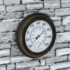 The Wall Thermometer is a necessity for any home! This convenient piece measures both temperature and humidity and is great to have in all seasons. With a sleek bronze finish, this clock-style hanging thermometer is a wonderful addition to any area of the home, indoors or outside; hang it on your patio, porch, deck, kitchen, or sunroom. Equipped with a 5.5” display face, you can easily read the temperature at glance, while the sturdy steel construction ensures that the gauge will survive any weather conditions. It’s an attractive and functional piece for your home! is committed to providing the consumer with the absolute best price and value on our entire line of products, which we ensure by applying a rigorous quality control process. br /> IMPORTANT: Avoid buying counterfeit products and transacting with unauthorized sellers. Look for our logo on the packaging for every one of our products. TEMPERATURE GAUGE FOR ALL SEASONS - This decorative clock-style outdoor thermometer gives readings in both Celsius and Fahrenheit. The handy built-in hygrometer measures and displays the humidity, so you are always ready for the weather in any season. ACCURATE READINGS - Designed with a precision coil, the outside thermometer calibrates automatically without batteries. Place the gauge in a shady area to get accurate temperature readings from -40-120 degrees Fahrenheit and -40-50 degrees Celsius. INDOOR/OUTDOOR USE - The wall thermometer is suitable for both indoor and outdoor use whether you hang it in the kitchen, by the pool, or on the deck. The gauge is easy to mount on a wall, post, or even on the side of a tree. ATTRACTIVE AND DURABLE - With a sleek hand-painted bronze finish, this hanging temperature thermometer features an easy-to-read 5.5-inch glass display face, while the sturdy steel construction ensures that the gauge can withstand most weather conditions. PRODUCT DETAILS - Materials: Steel Base and Glass Lens. Dimensions: (L) 8" x (W) 2". Color: Brushed Bronze.