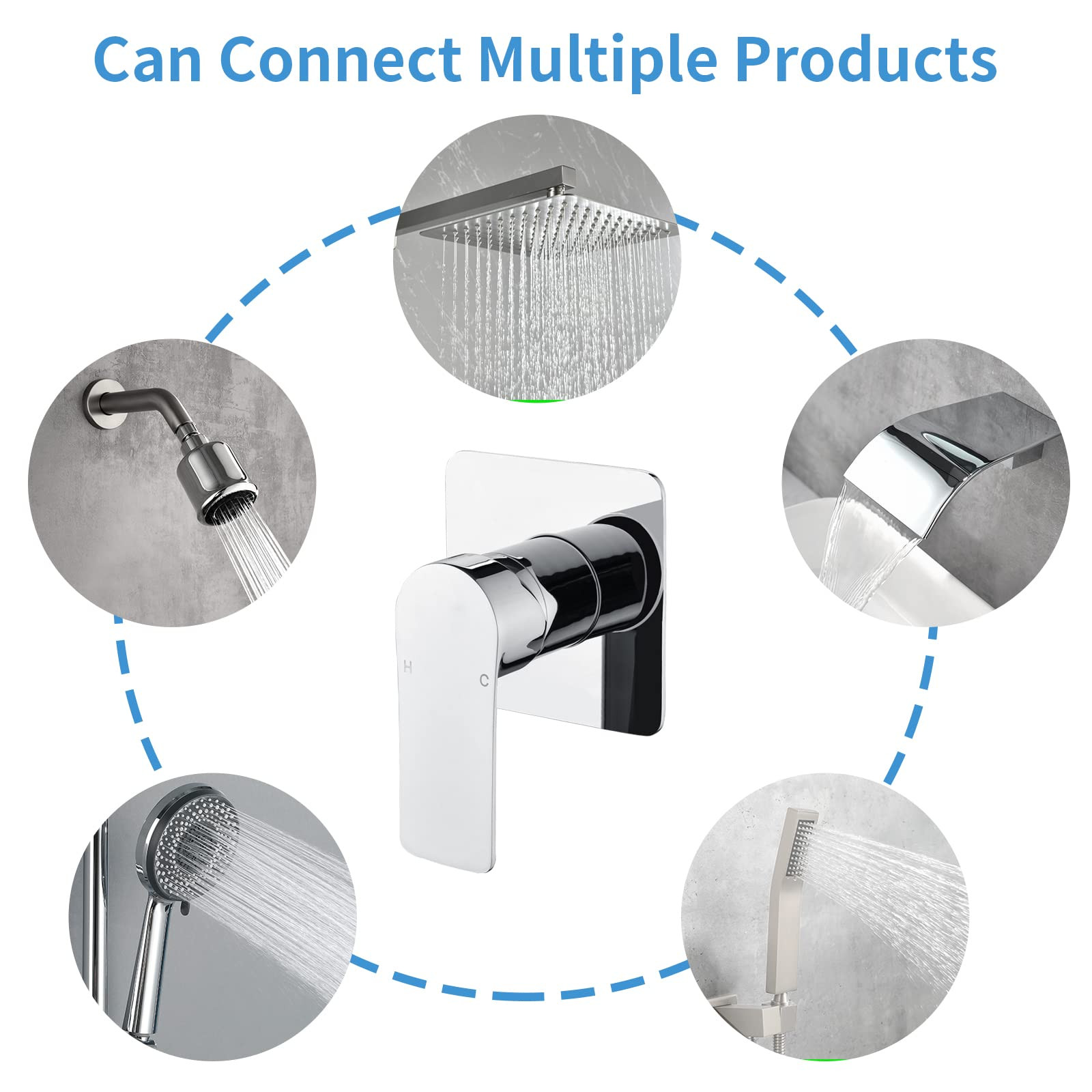 This valve can be perfectly matched with a variety of products, such as showerhead, hand shower, sprayer, waterfall spouts, etc. This shower rough-In mixer valve is casted from high quality brass to ensure durability and no corrosion, it is a great choice if you want to renovate your bathroom. The elegant chrome surface is suitable for many styles of bathrooms, it can efficiently fade-resistant and keep it as new. The size of the decorative plate of the shower valve is 3.94''*3.94'', which is very suitable as bathroom trim kit with decent size. U.S. standard NPT1/2'' connected.If you have any questions about the product, please feel free to contact us.