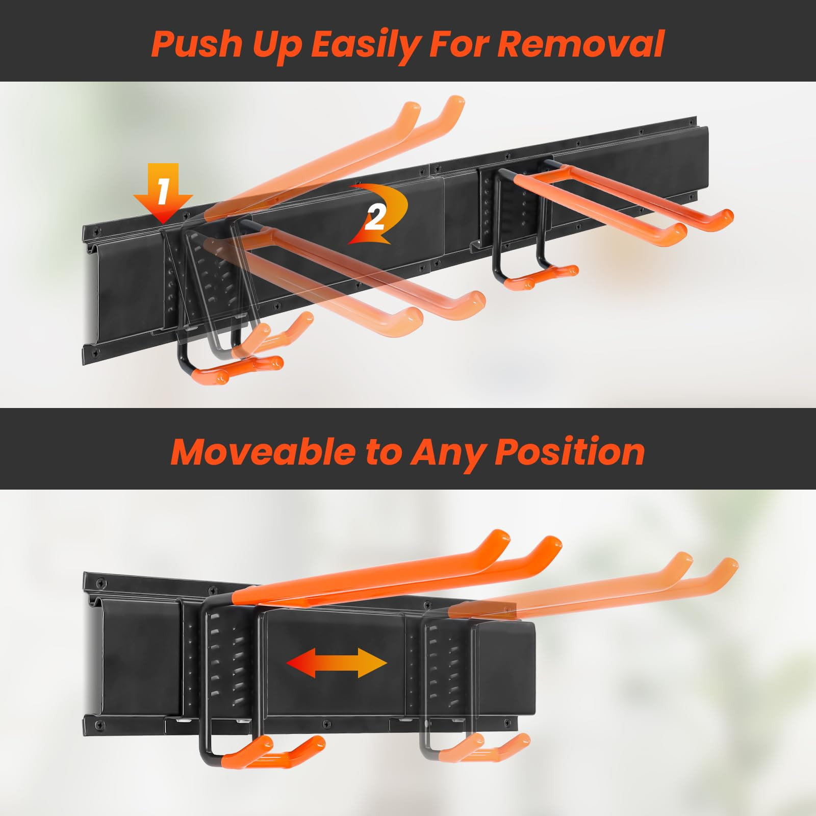 Wall Mount Tool Organization: Our garage tool organizer offers designated slots for all essential tools, ensuring superb organization in various spaces like the garage, utility room, and workshop. Say goodbye to jumbled messes and wasted time searching for tools Adjustable Garage Wall Tool Rack: With a 48-inch length, our adjustable garden tool holder wall mount organizer features 6 hooks and 3 rails to organize garage/lawn/garden tools efficiently, saving valuable floor space Sturdy Design: Crafted from premium carbon steel, our garage storage is double powder-coated for rust protection and durability. Extended screws and rubber-coated hooks prevent tools from slipping, ensuring long-lasting sturdiness for frequent use Easy Installation & Customization: The wall mount garage tool organizer comes simple instructions for quick setup. Hooks can be easily repositioned on the panel tracks to adapt to changing storage needs, providing a functional and organized tool wall Multi-Function Storage Rack: Garage storage system accommodates various items beyond garage tools, providing superb organization for garden tools, brooms, hoses, and more. Create an efficient work environment