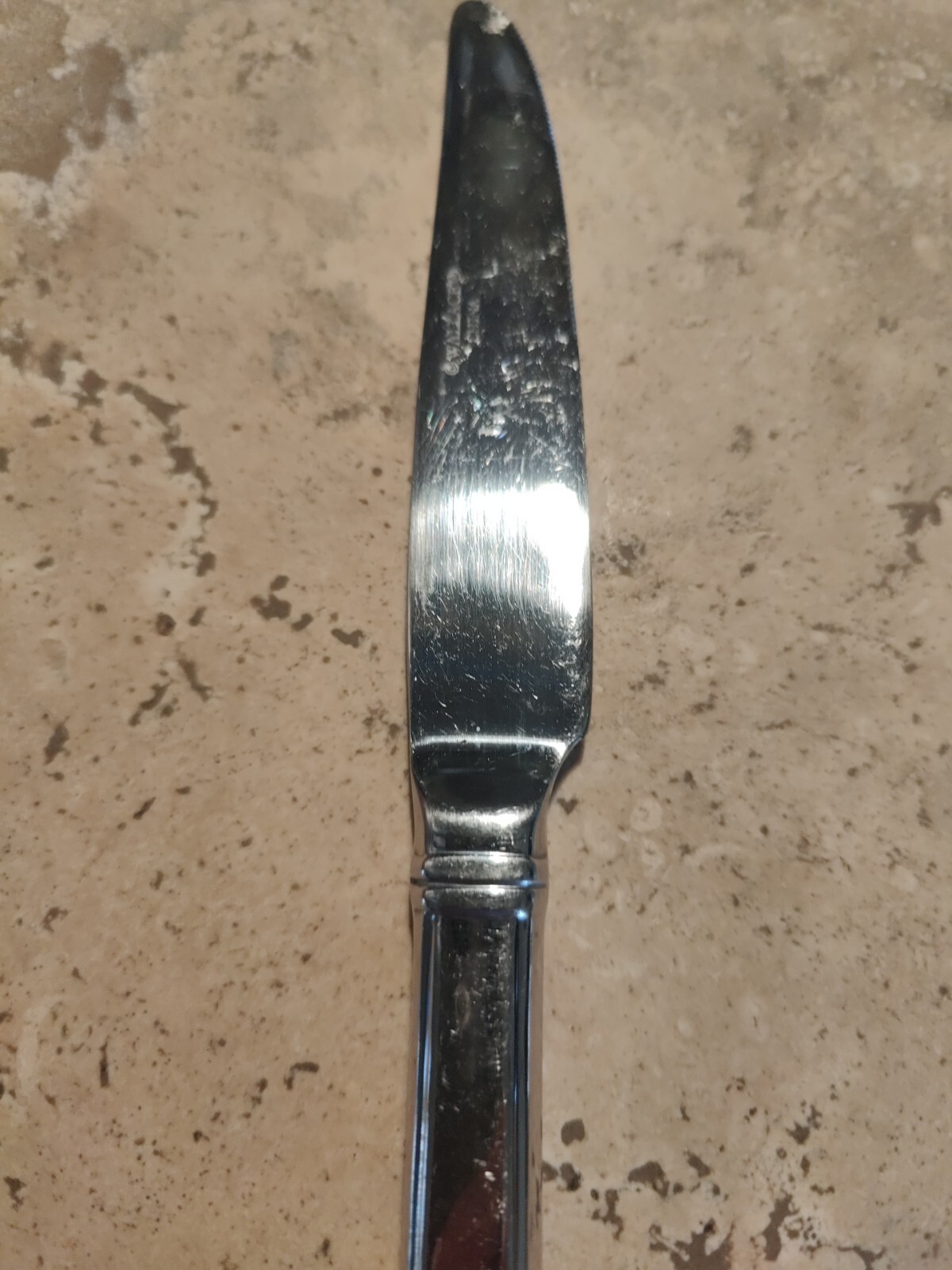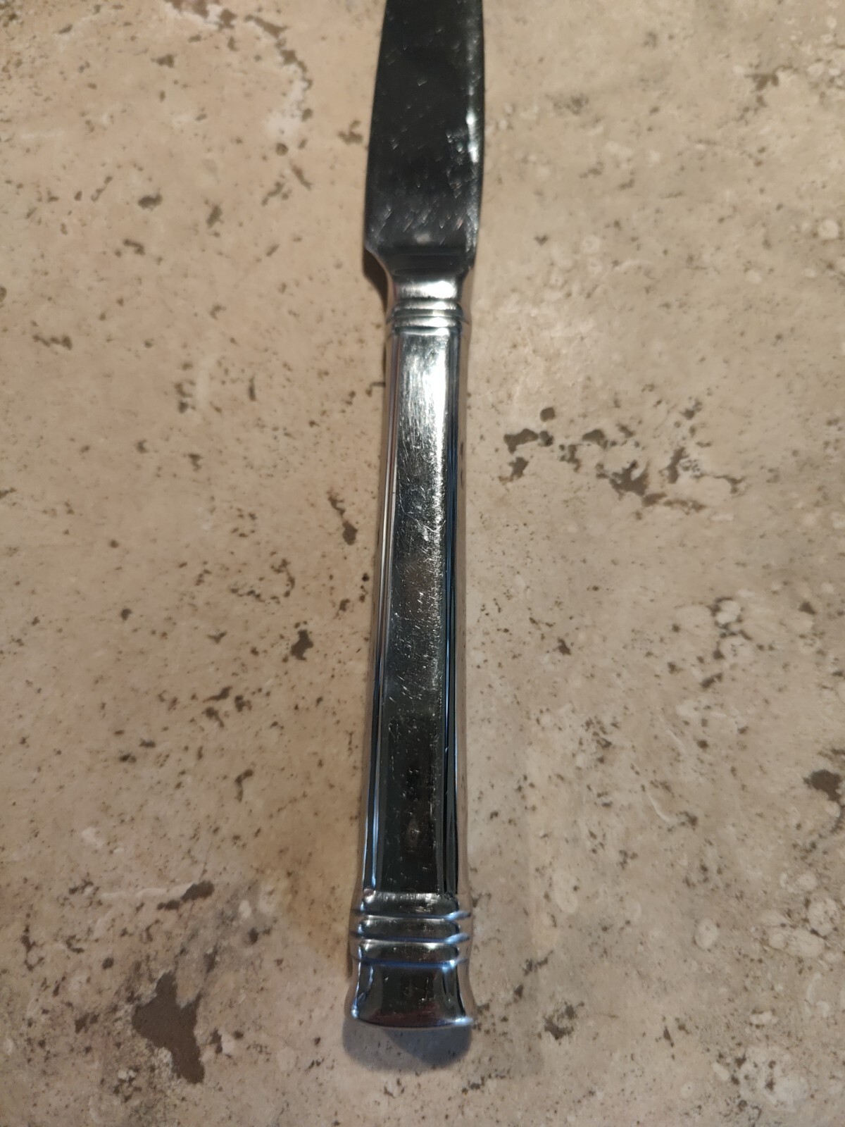 The Wallace ZENITH Glossy Dinner Knife is a sleek and modern 9.5" replacement piece of flatware to complete or expand your set. This is preowned and shows typical signs of wear from age and use including scratches and buffs.