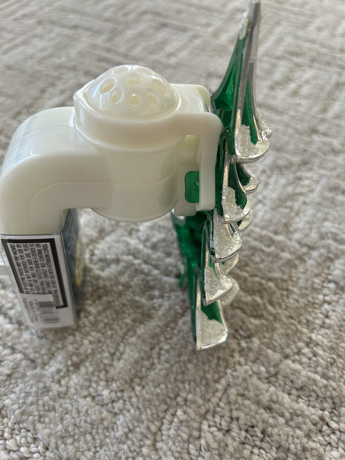 The green pine tree and snow design will make any room feel cozy during the holiday season. This wallflower diffuser is made of durable plastic and features a wall plug-in for easy installation.