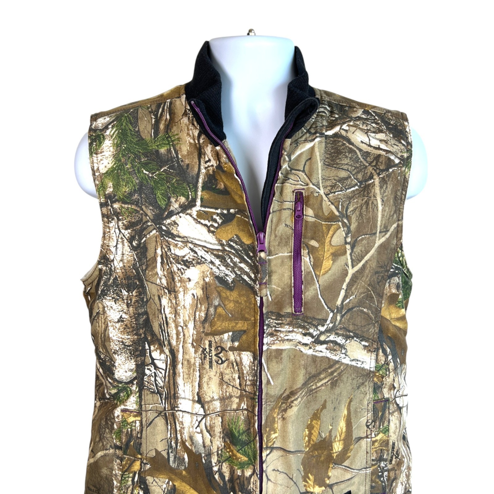 Walls Womens Realtree Camo Canvas Sherpa Lined Utility Vest Size M Purple zippers Excellent pre-owned-condition Measurements (approximate, laying flat) Bust (underarm to underarm): 20" Length: 23" Style: Hunting, Outdoors, Camping, Cabincore