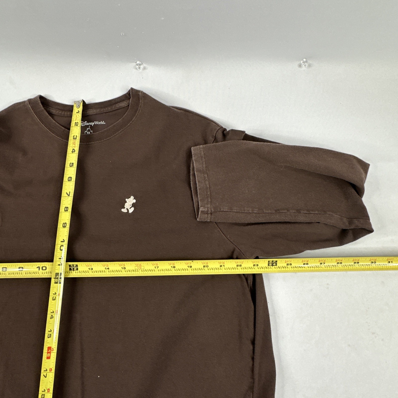 The product is a Walt Disney World Mickey Mouse brown long sleeve t-shirt in men's size 2X. This officially licensed shirt features the iconic Mickey Mouse character from the Disney franchise and is suitable for adults of any gender. The brown color adds a classic touch to the design, making it a must-have collectible for any Disney fan. Perfect for wearing around Walt Disney World or showing off your love for the beloved character.